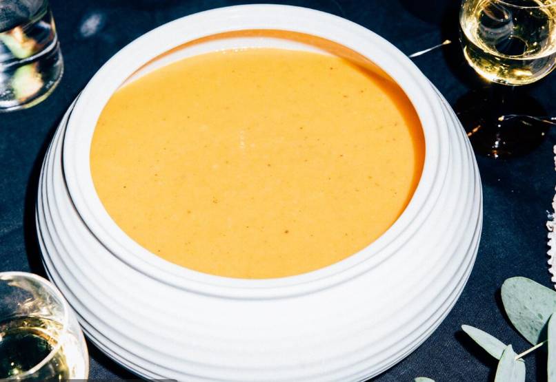 - Μεταφέρουμε όλα τα υλικά του ταψιού (μαζί με τα ζουμάκια τους) σε έναν πολυκόφτη, προσθέτουμε τον ζωμό και χτυπάμε μέχρι να γίνουν βελούδινη σούπα.