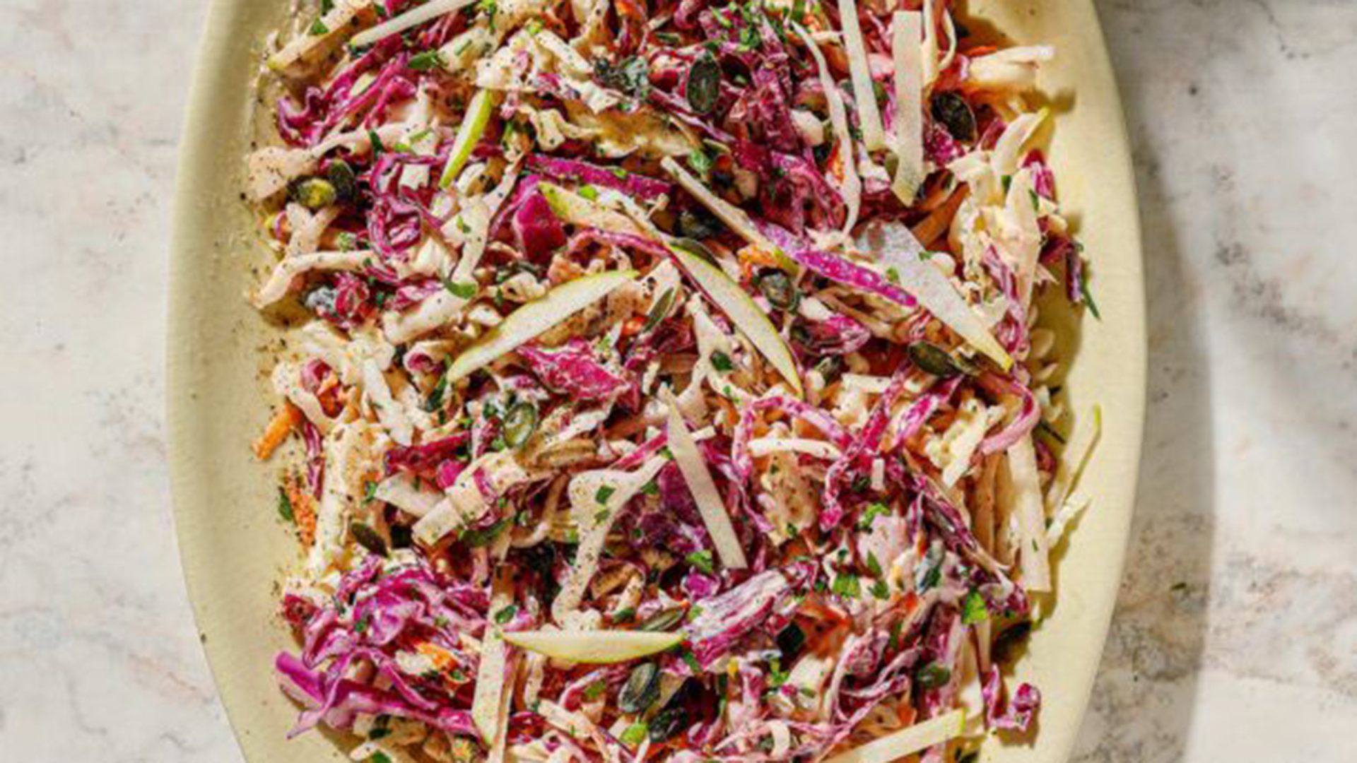 - Για να ετοιμάσουμε την λαχανοσαλάτα δίχρωμη με σάλτσα γιαουρτιού σε μεγάλη σαλατιέρα ανακατεύουμε τα δύο είδη λάχανου, τα καρότα, τον μαϊντανό και το μήλο. Αφήνουμε λίγους σπόρους στην άκρη, ρίχνουμε τους υπόλοιπους στη σαλάτα και ανακατεύουμε πάλι.