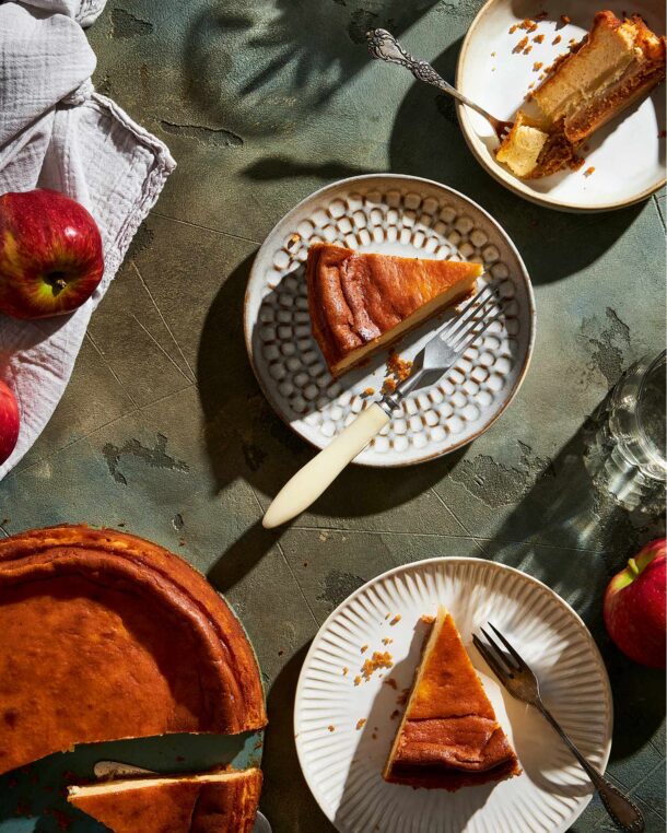 - Στρώνουμε τα μήλα πάνω από τη βάση μπισκότου σε ομοιόμορφη στρώση. Από πάνω αδειάζουμε το μείγμα του τυριού, απλώνοντάς το ομοιόμορφα.