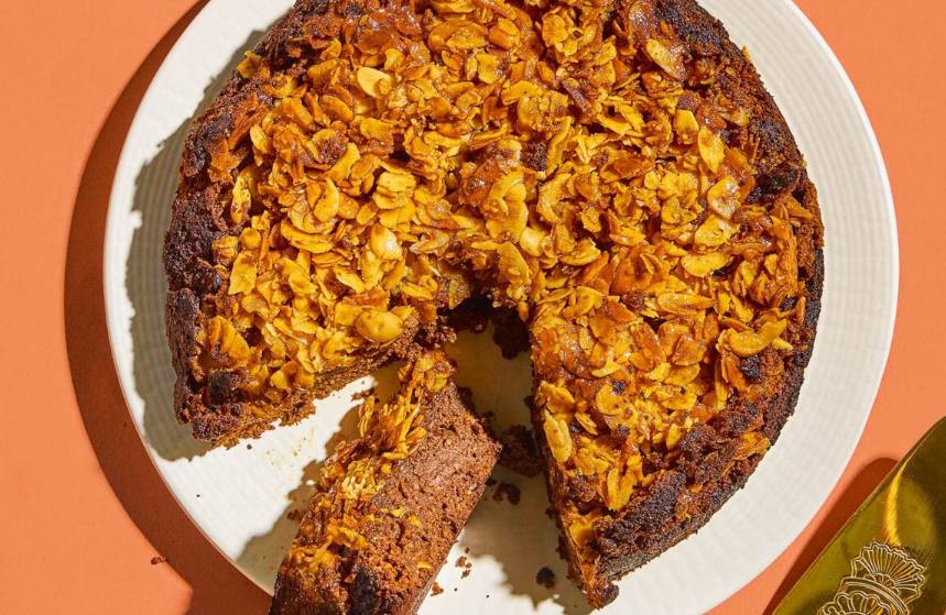 - Το αναποδογυρίζουμε σε σχάρα ή σε πιάτο σερβιρίσματος, έτσι ώστε τα αμύγδαλα να είναι από πάνω, και αφαιρούμε προσεκτικά τη λαδόκολλα. Αν πέσουν αμύγδαλα, τα επανατοποθετούμε στην επιφάνεια.