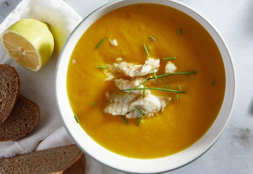 - Πολτοποιούμε τη σούπα με το ραβδομπλέντερ ή σε δόσεις στον πολυκόφτη και μοιράζουμε στα πιάτα μαζί με το ψαχνό ψαριού.
