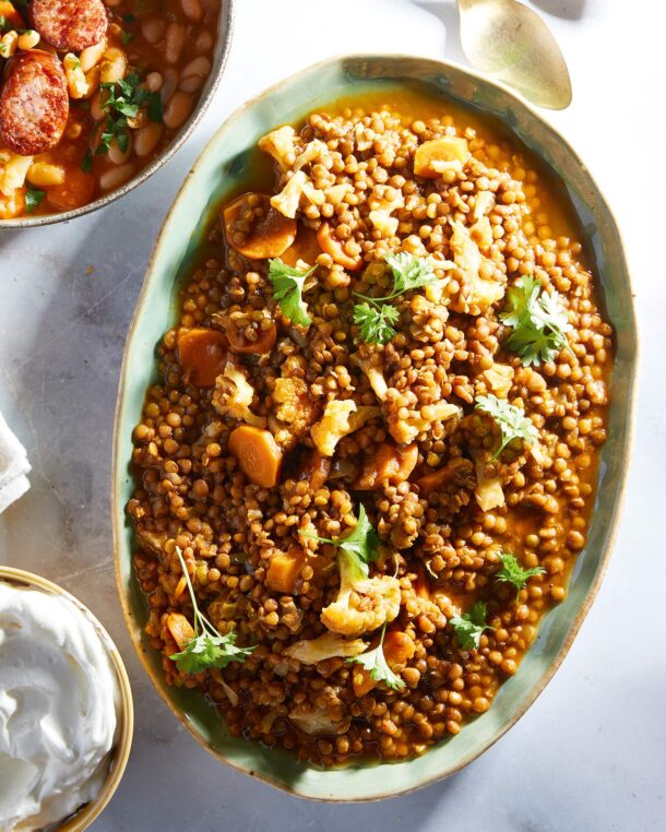 Πλούσιο, χειμωνιάτικο, ζουμερό φαγητό με τις ευκολόβραστες φακές και τα υλικά της εποχής, όπως πράσα, γλυκοπατάτες και κουνουπίδι. Για το σερβίρισμα, αν θέλουμε, βάζουμε πάνω στις φακές από 1 κουτ. σούπας γιαούρτι αγελάδας στραγγιστό. Ταιριάζει πολύ!