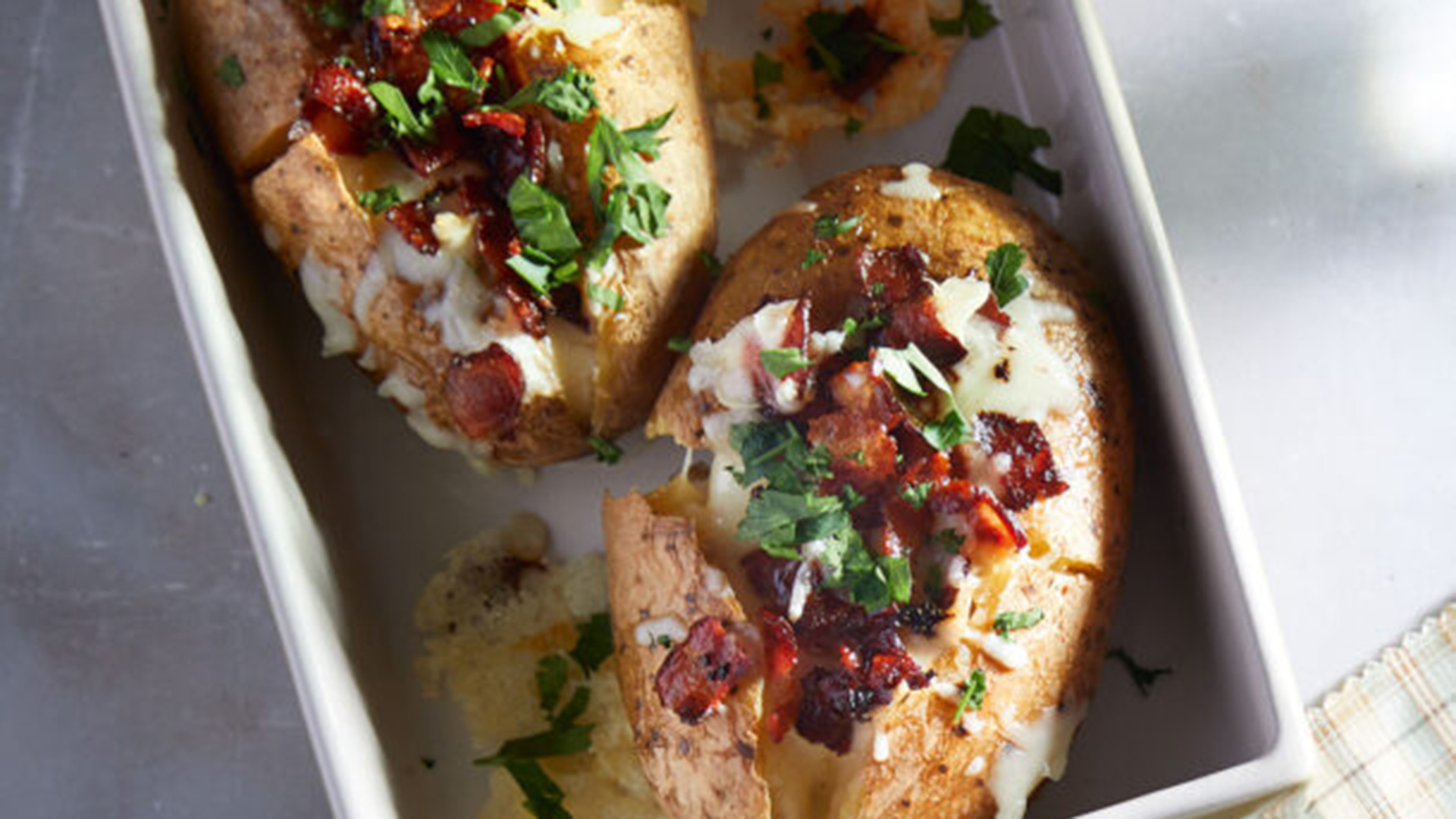 Ολόκληρες φουρνιστές πατάτες με μπέικον και κασέρι
