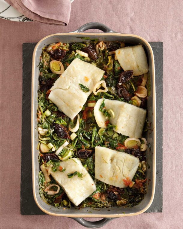 - Βάζουμε ομοιόμορφα πάνω στα χόρτα τα κομμάτια του μπακαλιάρου, με το δέρμα προς τα πάνω.