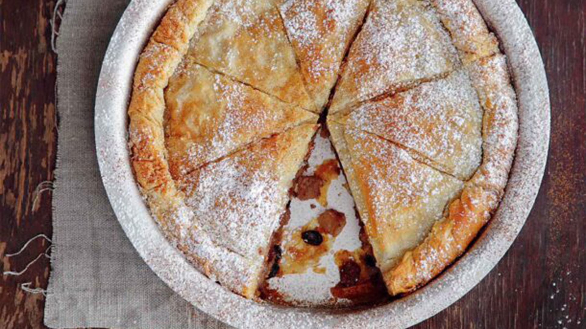 - Σκεπάζουμε τη γέμιση με τα υπόλοιπα φύλλα κρούστας, βουτυρωμένα και πασπαλισμένα με ζάχαρη ένα ένα. Βουτυρώνουμε την επιφάνεια της πίτας και τη χαράζουμε σε καρεδάκια.
