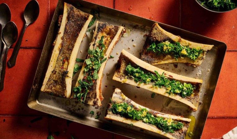 - Στρώνουμε τη λαμαρίνα του φούρνου με λαδόκολλα και απλώνουμε τα μοσχαρίσια κόκαλα με μεδούλι. Tα ραντίζουμε με το ελαιόλαδο και τα πασπαλίζουμε με το αλάτι.