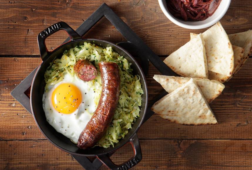 - Σε ατομικά πιάτα βάζουμε από ένα λουκάνικο, από ένα αυγό μάτι και δίπλα το λάχανο και το κρεμμύδι.