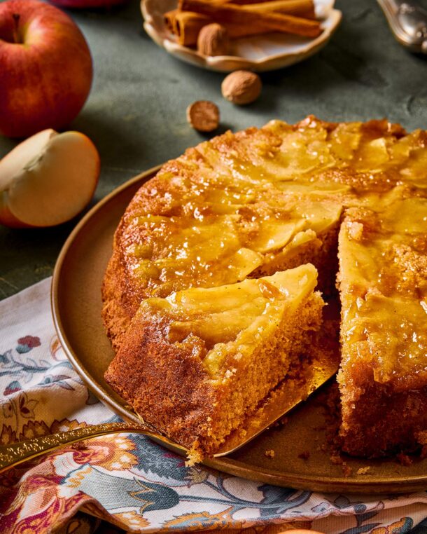 - Το αφήνουμε να κρυώσει για μόλις 10-15 λεπτά και αναποδογυρίζουμε προσεκτικά σε μια πιατέλα, ώστε τα καραμελωμένα μήλα να έρθουν στην επιφάνεια και λίγη σάλτσα να κυλήσει από τα πλαϊνά. Το σερβίρουμε ζεστό ή μόλις κρυώσει εντελώς.