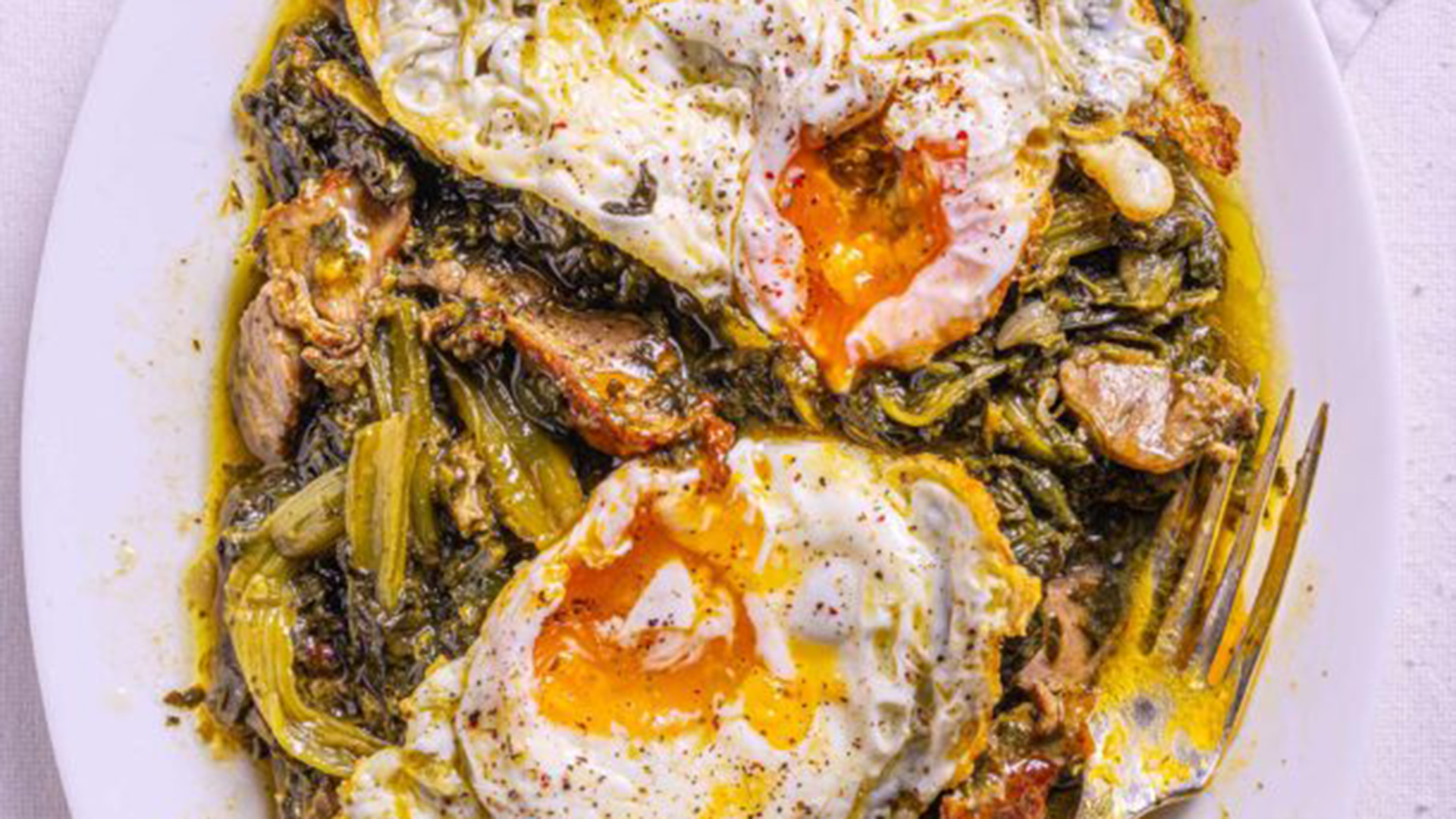 - Στην ίδια κατσαρόλα και στο ίδιο λάδι που θα έχει μείνει, τηγανίζουμε τα αυγά μάτια, αφήνοντας τον κρόκο τους να μείνει μελάτος – θα είναι η σάλτσα του φαγητού.