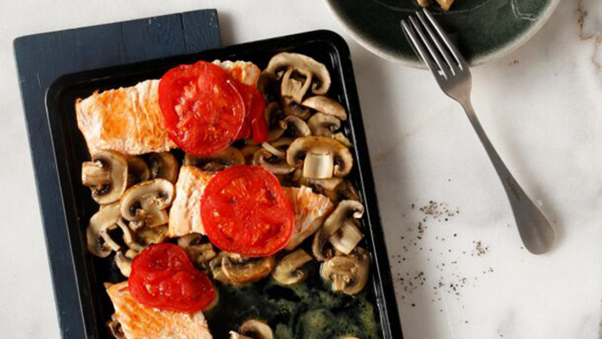- Γυρίζουμε τα φιλέτα σολομού και τα σκεπάζουμε με τις ροδέλες ντομάτας, για να κρατήσουν την υγρασία τους.