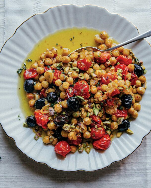Παρασκευή – Φουρνιστά ρεβύθια με ντοματίνια, ελιές και φυστίκια Αιγίνης