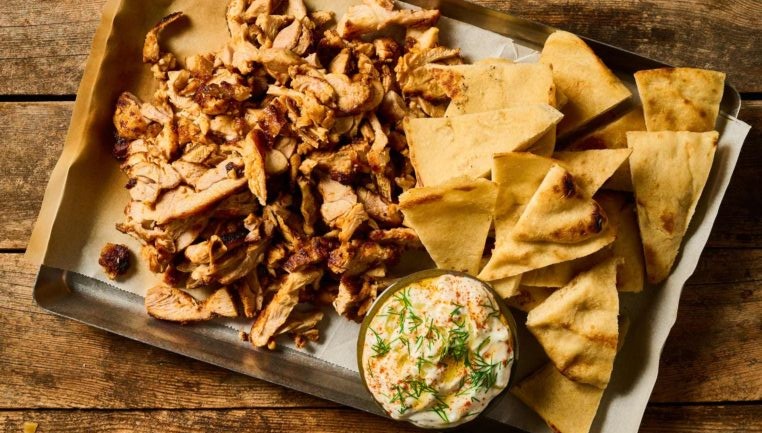 - Εναλλακτικά, πιάνουμε μια ολόκληρη πίτα με το ένα χέρι, βάζουμε από μια φούχτα γύρο και λίγο τζατζίκι, τυλίγουμε πρόχειρα σαν τάκος και σερβίρουμε στο χέρι.