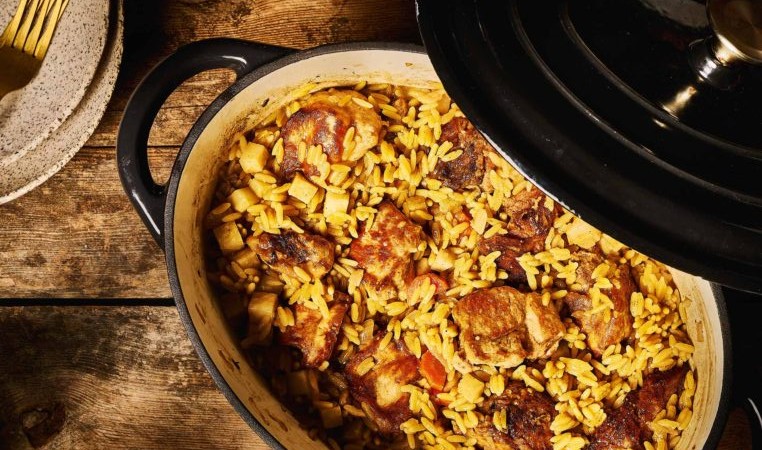 - Ξεφουρνίζουμε για λίγο, προσθέτουμε το κριθαράκι, ανακατεύουμε να απλωθεί ομοιόμορφα και ψήνουμε για 25 λεπτά με ξεσκέπαστο σκεύος, ανακατεύοντας μια-δυο φορές, μέχρι να μαλακώσει το κριθαράκι και να απορροφήσει τα περισσότερα υγρά.