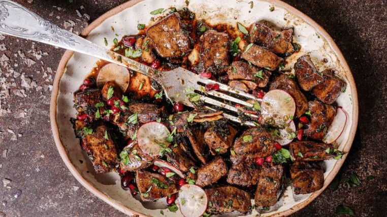 - Για την τηγανιά με συκωτάκια πουλερικών και πετιμέζι ροδιού, ξεκινάμε στραγγίζοντας και σκουπίζοντας σχολαστικά τα συκωτάκια για να στεγνώσουν εντελώς. Τα βάζουμε σε ένα μπολ, ρίχνουμε το ελαιόλαδο και ανακατεύουμε καλά.