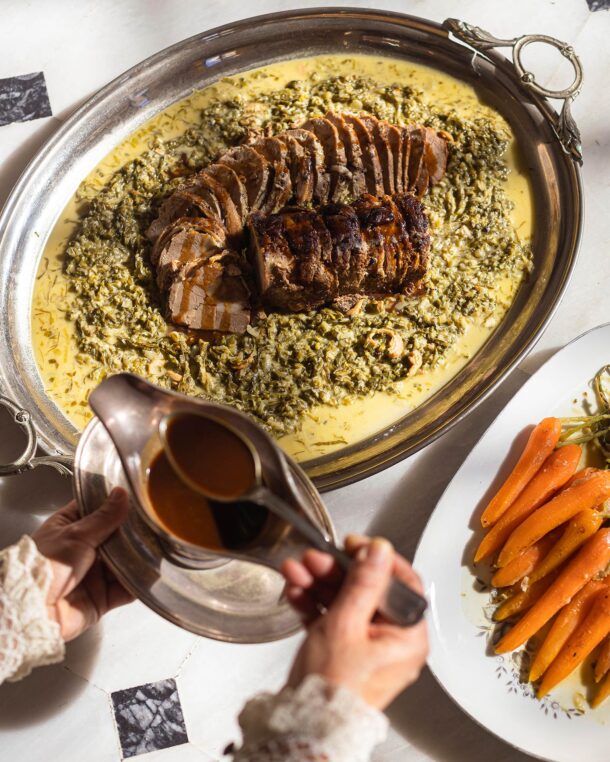 Σιγομαγειρεμένο κρέας που ποτίζει νοστιμιά μέσα σε έναν πλούσιο ζωμό και παραμένει τρυφερό και ζουμερό χάρη στο λαρδί το οποίο είναι βυθισμένο στη σάρκα του και στις πανσέτες που χρησιμεύουν ως προστατευτικό περιτύλιγμα. Βγαίνει εξαιρετικά χυμώδες, σχεδόν βελούδινο. «Από τις πιο ωραίες συνταγές, γιορτινή, ό,τι πρέπει για ένα κυριακάτικο τραπέζι», λένε οι μάγειρες, συμπληρώνοντας πως «αξίζει τον κόπο και είναι τεχνικά απολύτως σωστό».