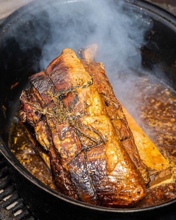 - Το ψήνουμε σε μεγάλη γάστρα ή τυλιγμένο σε λαδόκολλα μέσα σε ταψί στον φούρνο, στους 180°C, για περίπου 21⁄2-3 ώρες.