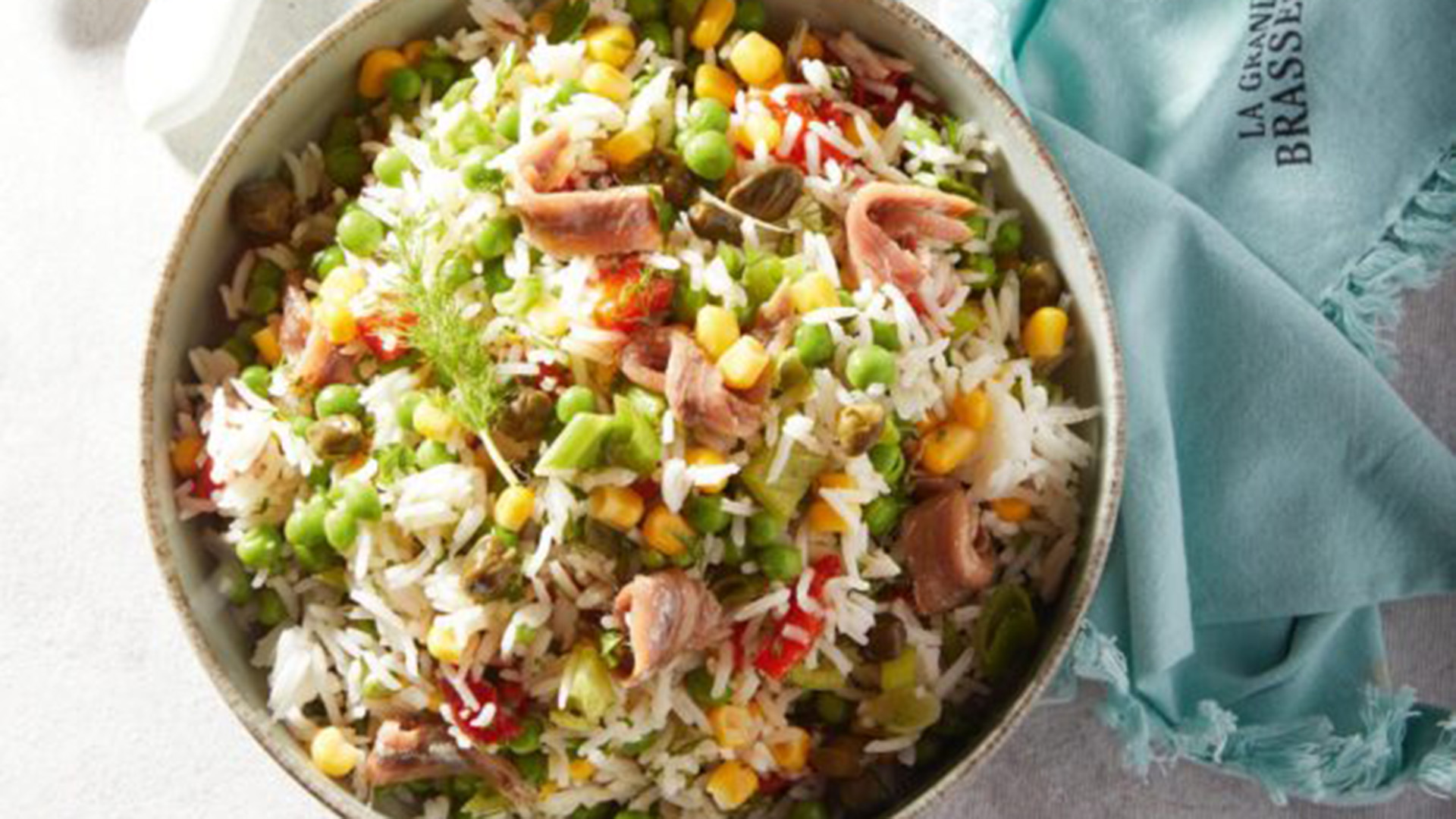 - Για να φτιάξουμε ρυζοσαλάτα με αρακά και αντσούγιες, αρχικά βράζουμε το ρύζι σε μπόλικο αλατισμένο νερό που κοχλάζει για 5 λεπτά.