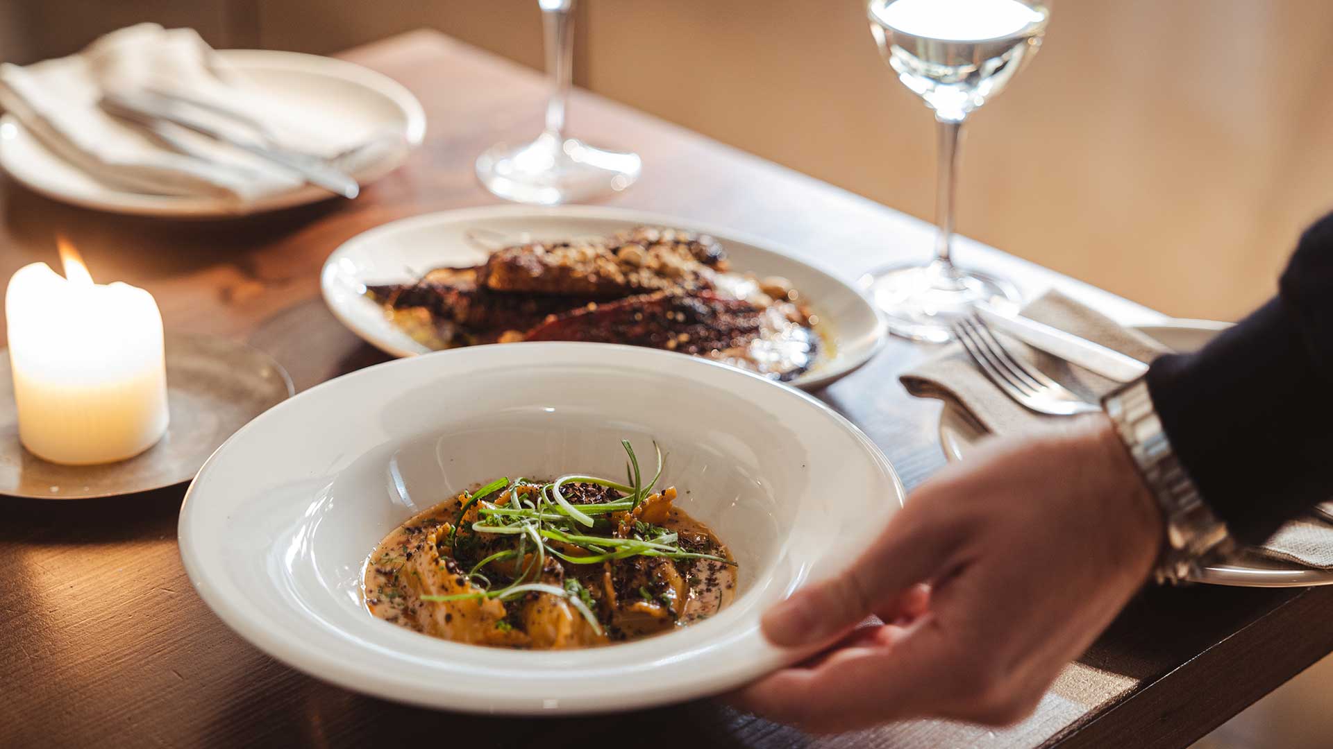 Το More Φίλings –προέκταση του φούρνου Φίλings, που πρωτογνωρίσαμε στο Παγκράτι– το πρωί λειτουργεί ως μπραντσάδικο, ενώ στις έξι το απόγευμα αλλάζει ρυθμό, σερβίροντας το βραδινό μενού του. Εφτασα το περασμένο Σάββατο νωρίς, τα κεριά μόλις είχαν ανάψει και από τα ηχεία ακουγόταν ραπ μουσική στη σωστή ένταση. Ο χώρος είναι λιτός: ξύλινα καθίσματα, μωσαϊκό στο πάτωμα, λευκοί τοίχοι. Έχει μια αισθητική που στην αρχή σου φαίνεται λίγο ψυχρή, αλλά γρήγορα ζεσταίνεται από το ευγενικό και προσεγμένο καλωσόρισμα του Βάιου Κορομηλά, ενός από τους ιδιοκτήτες, και της ομάδας του. Νιώθεις ότι μπαίνεις σε ένα νεανικό στέκι που έχει την ωριμότητα της σωστής φιλοξενίας.