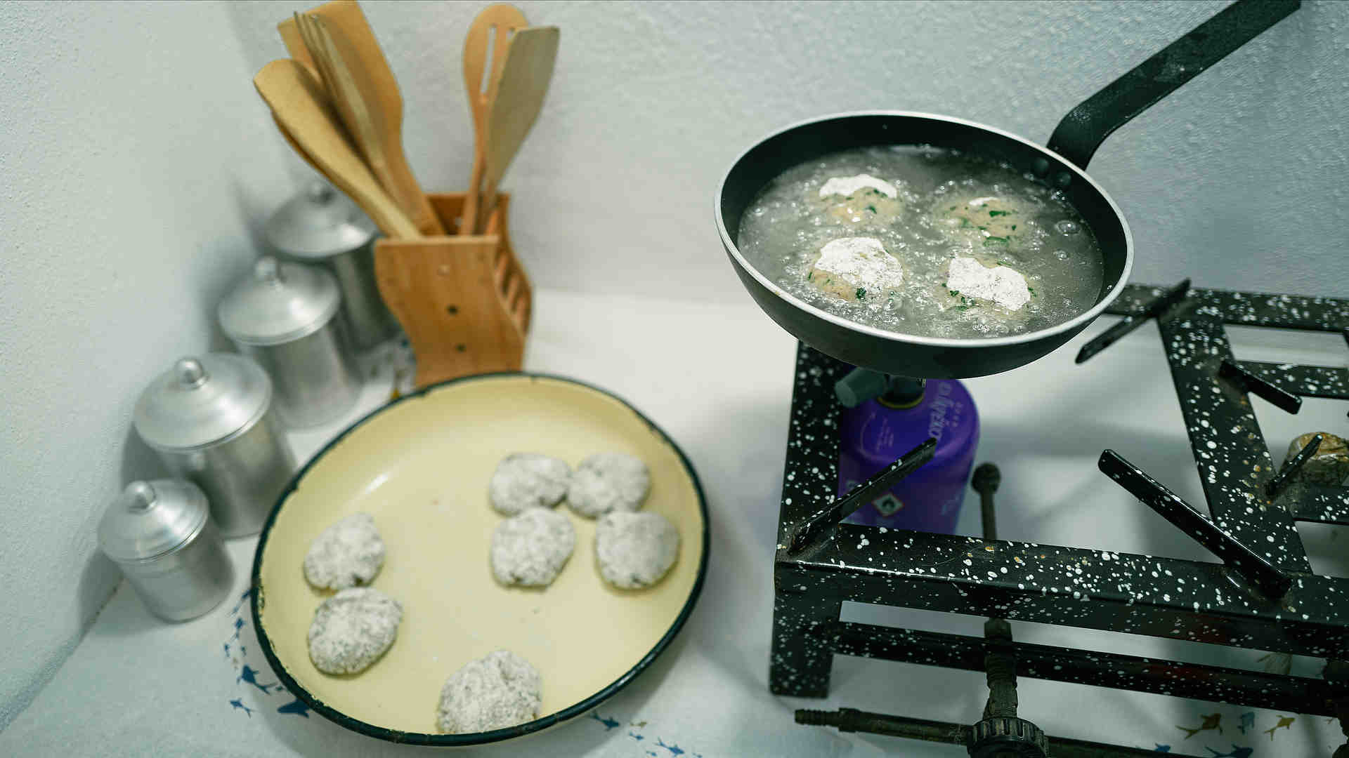Ο Λεονάρδος Ρούσσος περνάει το ψωμί από το μυλαράκι – έναν παλιό μύλο χειρός από χυτοσίδηρο, για να γίνεται καλύτερα η ενσωμάτωση και να μη βρίσκεις ψωμί στο δάγκωμα. «Το ψωμί να είναι μπόλικο», λέει. Μισό μισό. Μισός κιμάς, μισό ψωμί. Κατά τα άλλα, δεν έχει πολλά πολλά η συνταγή. Είναι ένας απλός και χορταστικός κεφτές, με κρεμμύδι, μαϊντανό και τίποτε άλλο. Συνταγή μιας cucina povera που άνθησε στις παρυφές της αστικής γαστρονομίας της Ερμούπολης. «Είναι από τα πρώτα φαγιά που έβαλε ο παππούς στην ταβέρνα του», λέει ο Λεονάρδος, για να συμπληρώσει ότι «η χάρη τους έφτασε μέχρι την Κορέα, αφού τον είχαν βιντεοσκοπήσει να τα φτιάχνει για ένα κορεατικό ντοκιμαντέρ».
