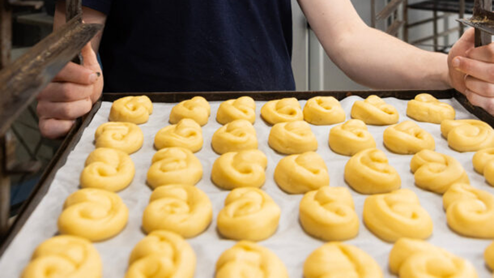 - Κόβουμε μικρά κομμάτια ζύμης, βάρους περίπου 40 γρ., και πλάθουμε το καθένα σε κορδόνι λεπτό και στη συνέχεια το τυλίγουμε σε σαλίγκαρο ή στριφογυρίζουμε τις άκρες προς τα μέσα ή πλάθουμε σε ό,τι σχήμα μας αρέσει.