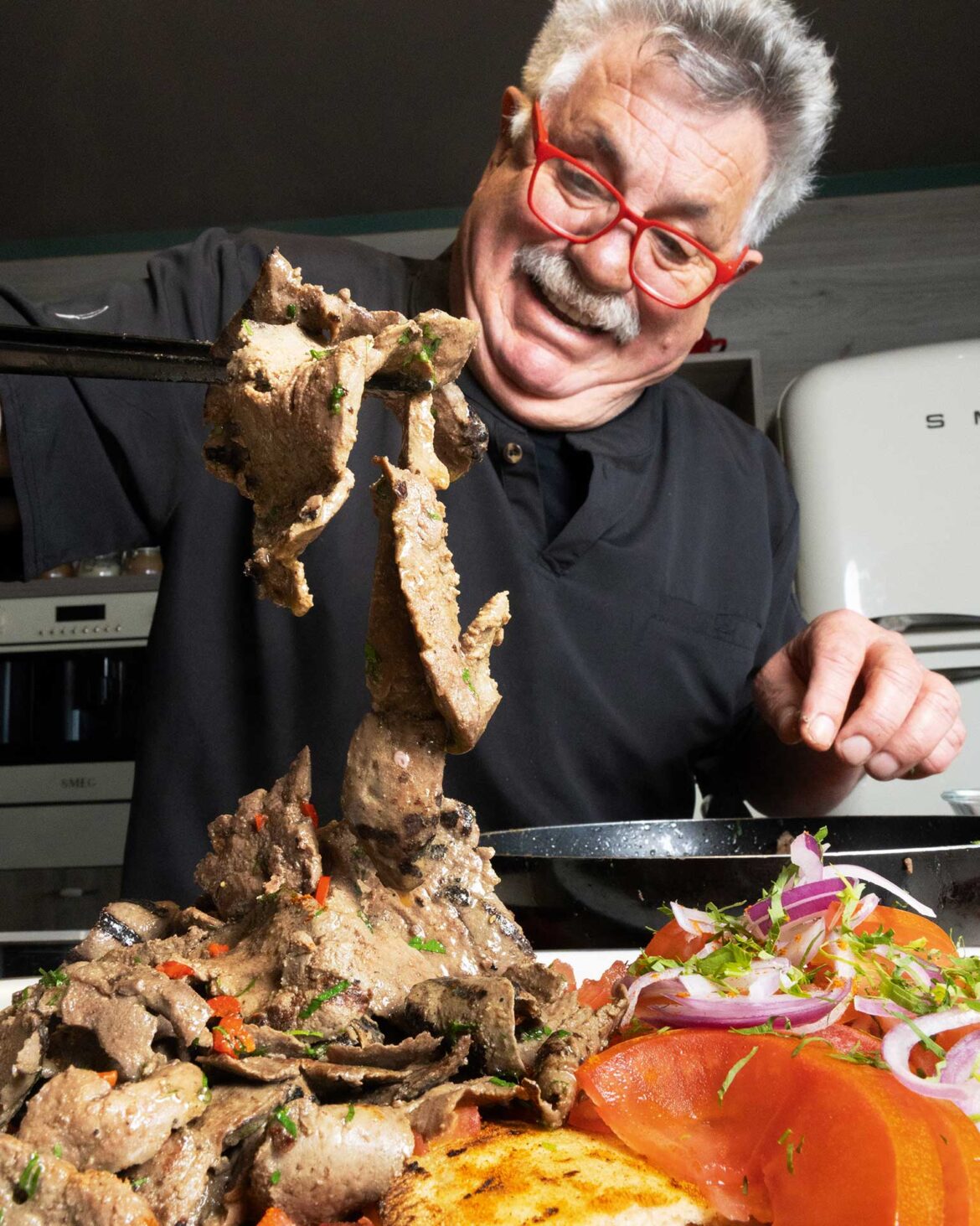 Ο μετρ της θάλασσας αφήνει για λίγο τις ουρές πεσκανδρίτσας και τα αυγοτάραχα και ετοιμάζει για τον πασχαλινό Γαστρονόμο ένα τραπέζι με δύο πιάτα: έναν πρωτότυπο μεζέ από συκώτι, σε μορφή «γύρου», με ιδιαίτερο τζατζίκι και πίτες για σουβλάκια, και ένα λαχταριστό αρνάκι στη λαδόκολλα με λαχανικά και μυρωδικά. Και οι δύο συνταγές είναι εύκολες και σχετικά γρήγορες, ώστε να χαρούμε τη γιορτή με τους δικούς μας και όχι πάνω από την κουζίνα.
