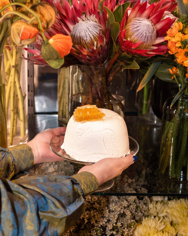 - Ξεφορμάρουμε σε πιατέλα, αφαιρούμε το τουλουπάνι και σερβίρουμε με κομμάτια κηρήθρας και μέλι.