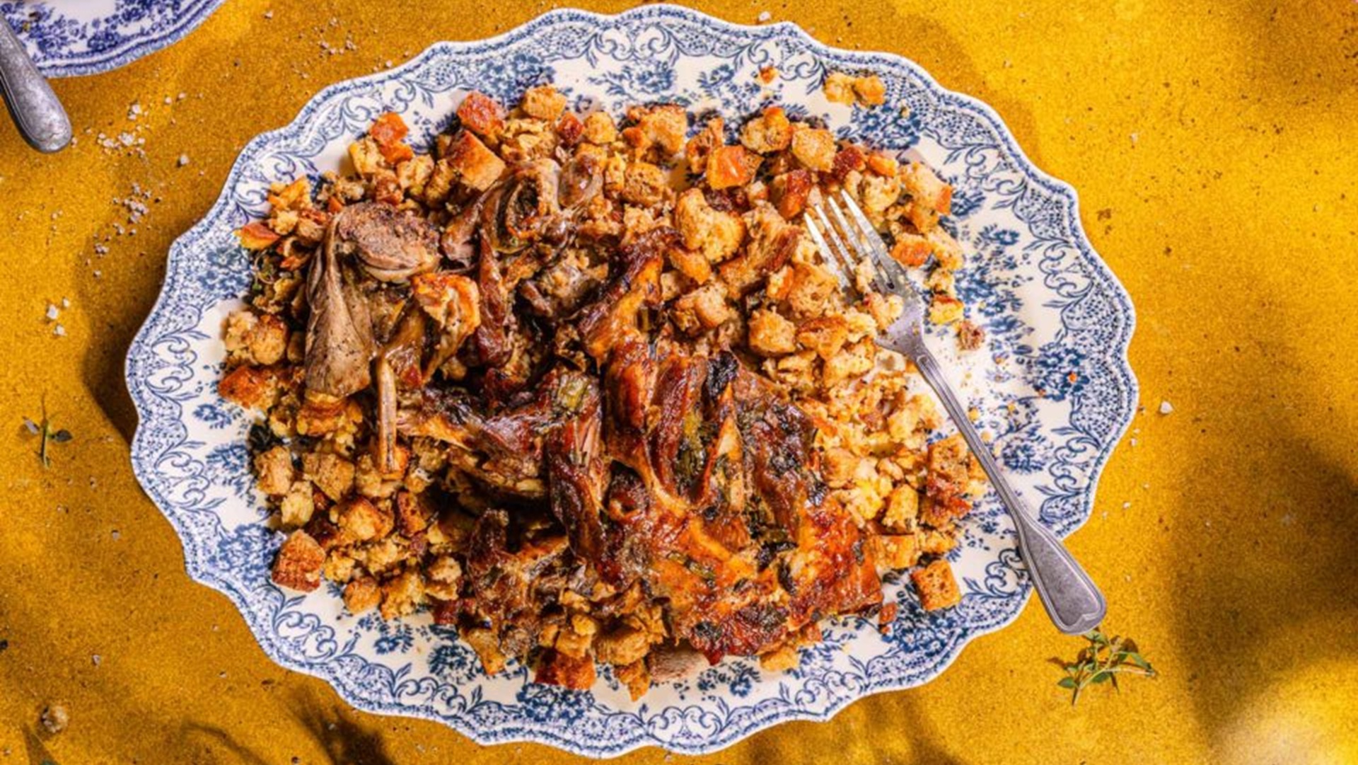 Αυθεντική συνταγή της αγροτικής κουζίνας του Εβρου, με κομματάκια ψωμιού (εν είδει κρουτόν) να ψήνονται μαζί με το αρνί και τα μυρωδικά, αντί για ρύζι ή πατάτες.