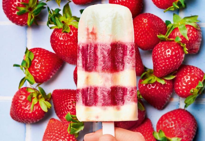 - Γεμίζουμε 8 φόρμες για παγωτό ξυλάκι εναλλάξ με το μείγμα γιαουρτιού και τον πολτό φράουλας, φτιάχνοντας τέσσερις στρώσεις ανά ξυλάκι.