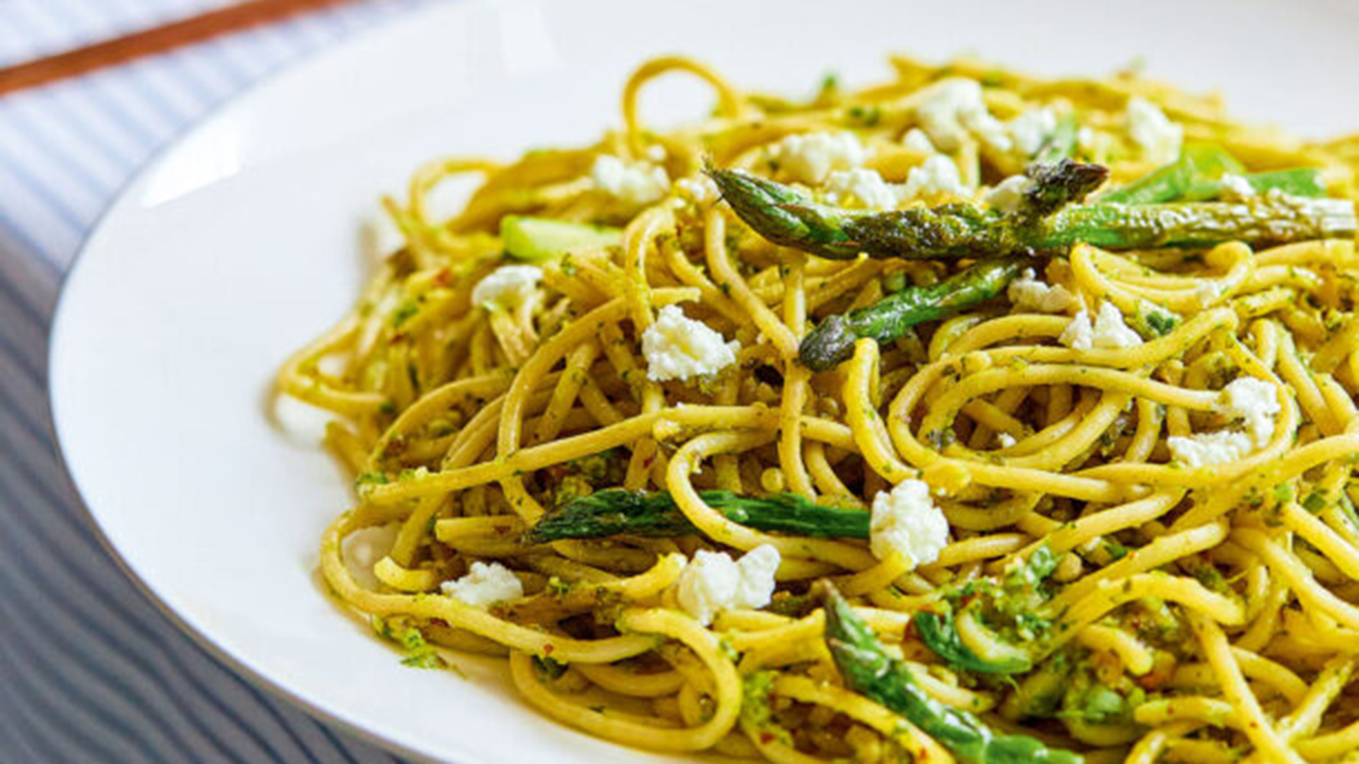 - Όταν είναι έτοιμα τα ζυμαρικά, τα βγάζουμε από το νερό τους με μια πιρούνα (έτσι παίρνουμε μαζί και λίγο από το νερό τους, χρήσιμο για να ολοκληρώσουμε το μαγείρεμά τους), τα ρίχνουμε στα σπαράγγια και μαγειρεύουμε για 2 λεπτά, ανακατεύοντας.