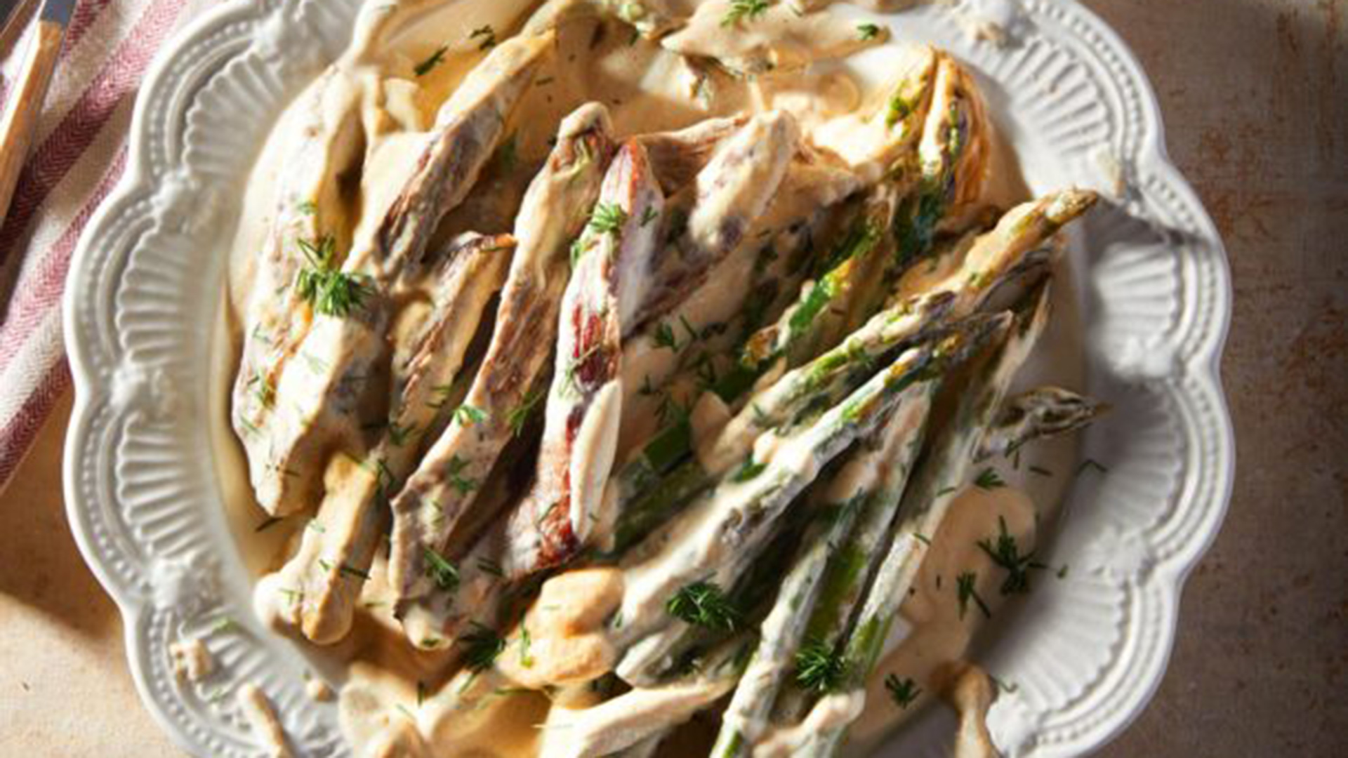 Το εκλεκτό φιλέτο και τα φίνα σπαράγγια μπαίνουν στο τηγάνι μαζί με ξινόκρεμα για μια απίθανη τηγανιά.