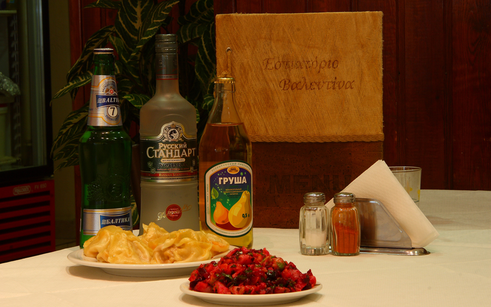 Το φαγητό: Ξεκινήσαμε φυσικά µε πιροσκί κιµά και πατάτας, καλοτηγανισµένα και µε τη σωστή ζύµη, ρωσική σαλάτα -καµία σχέση µε την «ελληνική»-, πλούσια σε γεύση και αρκετά λιπαρή όπως τη φτιάχνουν στην πατρίδα της, µαντί στον ατµό, τα ζυµαρικά τους δηλαδή που είναι σαν πουγκιά µεγάλου σχετικά µεγέθους και γεµιστά µε κιµά, και το καλύτερο ίσως πιάτο της Βαλεντίνας, το σασλίκ. Είναι το γνωστό ουζµπέκικο σουβλάκι από αρνί, µαριναρισµένο σε ένα µείγµα -που δεν µας είπαν τι υλικά έχει- για αρκετές ώρες, το οποίο έρχεται και λιώνει στο στόµα. Συνοδεύεται από τηγανητές πατάτες και ροδέλες κρεµµυδιού. Στον κατάλογο θα βρείτε, φυσικά, και το γνωστό µοσχάρι στρογκανόφ, αλλά το αφήσαµε για µια επόµενη φορά µε χαµηλότερη θερµοκρασία.