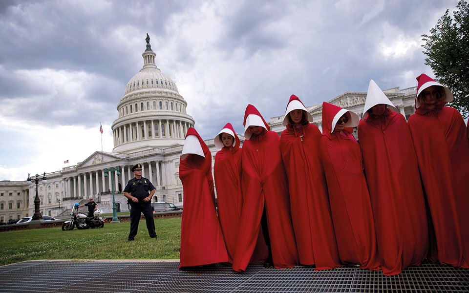 Ίσως το πιο απτό σύγχρονο παράδειγμα ήρθε με το δυστοπικό «Handmaid’s Tale», το ιδιοφυές σύμπαν της Μάργκαρετ Άτγουντ που μετενσαρκώθηκε σε τηλεοπτική σειρά από τον παραγωγό Μπρους Μίλερ του Hulu. Η ρετροφουτουριστική σειρά, όπου ένα θεοκρατικό καθεστώς των ΗΠΑ έχει υποτάξει τις γυναίκες που μπορούν να τεκνοποιήσουν σε εξαρτήματα αναπαραγωγής, μπορεί σε πρώτη ματιά να φαντάζει ως υπερβολικό σενάριο επιστημονικής φαντασίας. Την εποχή ωστόσο που ο -ευτυχώς πρώην- Αμερικανός πρόεδρος έχει καυχηθεί πως η δημοσιότητά του του επιτρέπει να αρπάζει τις γυναίκες από τα γεννητικά όργανα ή που το δικαίωμα στην άμβλωση τίθεται υπό αμφισβήτηση σε χώρες της Δύσης, οι σύγχρονες γυναίκες έχουν κάθε λόγο να ταυτίζονται με τις «θεραπαινίδες» του απολυταρχικού καθεστώτος του φανταστικού κράτους της Γκίλεαντ.