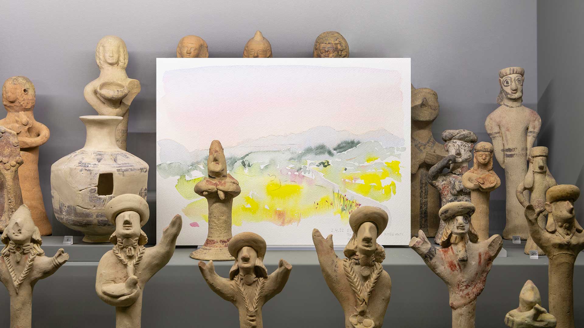 Μέσα στην προθήκη, πίσω από ένα μικρό πήλινο ομοίωμα πλοίου με κωπηλάτη της κυπρο-αρχαϊκής περιόδου, ξεπροβάλλει μια ζωηρή υδατογραφία με θαλασσινά και γήινα χρώματα. Στο κάτω μέρος της ακουαρέλας εντοπίζω ένα αχνό χειρόγραφο σημείωμα. «23.4.19 Μεγάλη Τρίτη, Γιαλούσα, στην κορυφή του λόφου, ανύπαρκτο το σπίτι». Από τη μία το έκθεμα, που ανακαλύφθηκε στην κατεχόμενη Αιγιαλούσα πριν την τουρκική εισβολή. Από την άλλη η ζωγραφιά, που δημιουργήθηκε εκεί, στον ίδιο τόπο. Η συμβολική συνομιλία τους στο παρόν ενώνει την Κύπρο, έστω και στον χρόνο. Άλλωστε, αυτός ήταν και ο αρχικός σκοπός της Κατερίνας Ατταλίδου όταν σχεδίαζε την έκθεση με τίτλο «Στον ίδιο τόπο». Να μιλήσει «για την πεθυμιά του τόπου, για το ολόκληρο που είναι μισό», όπως μου εξηγεί.