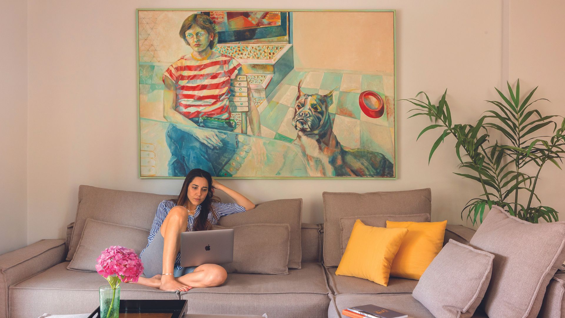 Στον τοίχο, έργο σε ακρυλικό Αρλεκίνος της μητέρας της, Κορίνας Πρεβεδουράκη, από παλιά της ατομική έκθεση, καρέκλες-κειμήλιο από τη γιαγιά της, custom made τραπέζι, φωτιστικό οροφής Bo Concept. (Φωτογραφία: Αλίνα Λέφα)