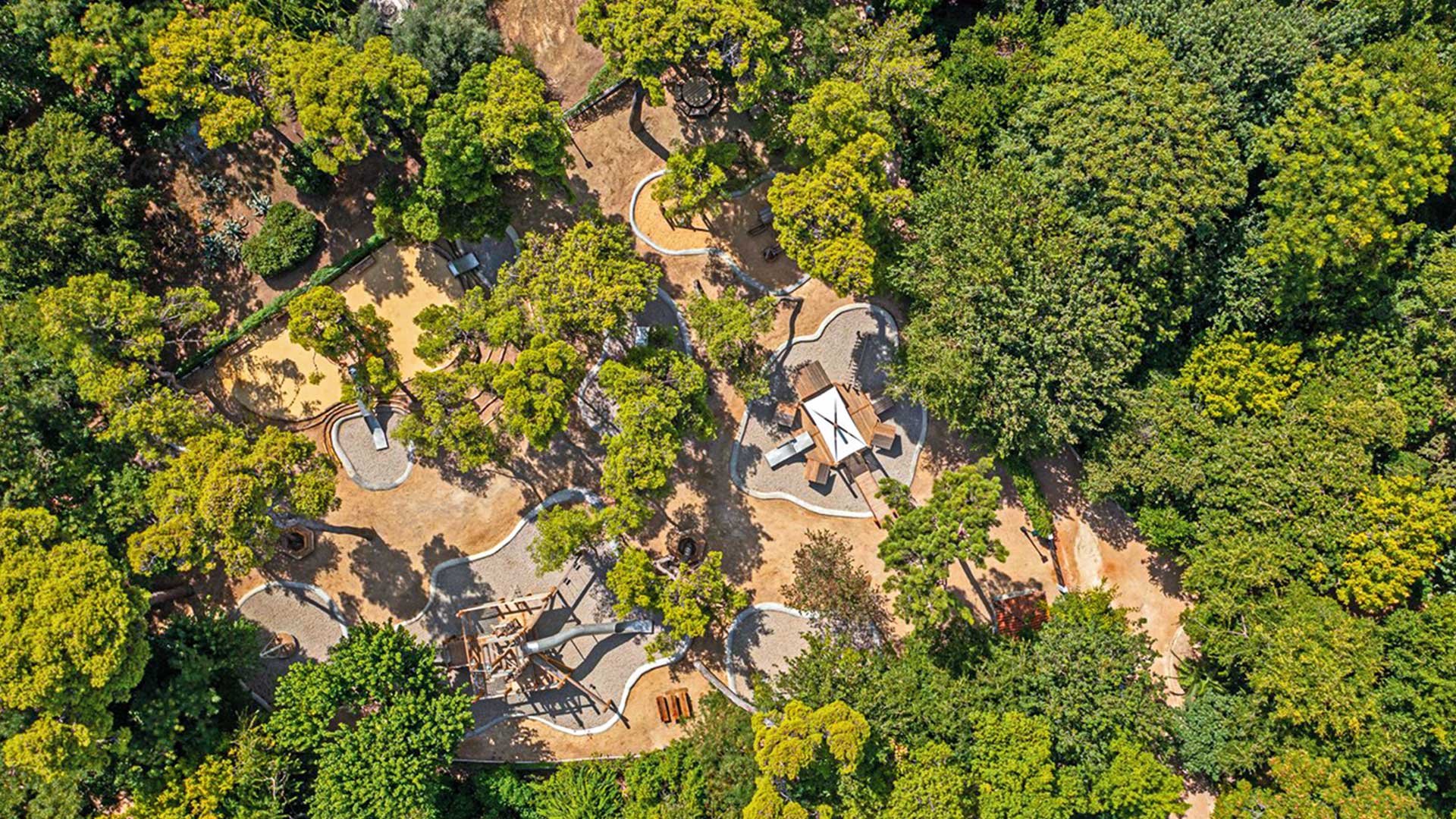 Πιο συγκεκριμένα, η παιδική χαρά χωρίζεται σε τρεις διαφορετικές ενότητες: η πρώτη απευθύνεται σε παιδιά προσχολικής ηλικίας με το νερό και την άμμο να έχουν τον πρωταγωνιστικό ρόλο σε τέσσερα διαφορετικά σκάμματα, η δεύτερη αφορά όλες τις ηλικίες μέσα από πολλές και διαφορετικές λειτουργίες οι οποίες ξεκινούν από παιχνίδια αιώρησης και φτάνουν μέχρι παιχνίδια ρόλων, και, τέλος, η τρίτη απευθύνεται και πάλι στην προσχολική και σχολική ηλικία με καθίσματα σαν φωλιές καθώς και έναν περιστρεφόμενο μύλο. Τι θα ξεχώριζα προσωπικά; Την κατασκευή που θυμίζει κάστρο καθώς και την τσουλήθρα-πυραμίδα στη δεύτερη ενότητα – την ίσως πιο εντυπωσιακή τσουλήθρα που έχω δει, δηλαδή, με τα ίδια μου τα μάτια.
