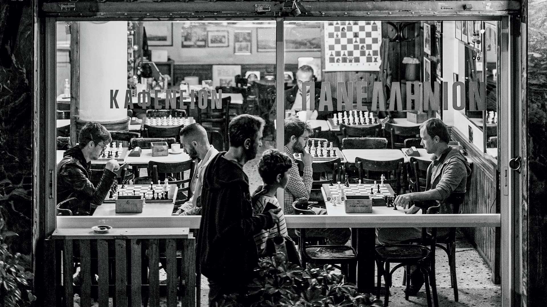 «Με ρωτάς γιατί να παίξεις σκάκι;» λέει ο 29χρονος Μάξιμος, που τον πετυχαίνουμε στο παραδοσιακό καφενείο «Πανελλήνιον» λίγο πριν από το καθιερωμένο τουρνουά του Σαββάτου. «Μπορείς να χαζεύεις για ώρες στο 9GAG ή στο reddit, αλλά αυτό είναι χάσιμο χρόνου. Ο σκακιστής βλέπει τα αποτελέσματα της άσκοπης χρήσης του διαδικτύου, κάνει μια στροφή και το χρησιμοποιεί σαν εργαλείο». Η ιστορία του θρυλικού καφενείου, το οποίο κοσμούν πίνακες από κορυφαίους σκακιστές, κρατάει από το 1885 – πολλές δεκαετίες πριν εμφανιστεί το ίντερνετ, δηλαδή. Στην τηλεόραση παίζει χωρίς ήχο ένας ποδοσφαιρικός αγώνας. Όσο καταφθάνουν οι παίκτες και ο διαιτητής στήνει τα χρονόμετρα, ο ιδιοκτήτης μάς εξηγεί τι έχει αλλάξει τα τελευταία χρόνια. «Τις Πέμπτες και τις Παρασκευές το καφενείο γεμίζει, και όχι όπως παλιά με εξηνταπεντάχρονους, αφού βλέπεις παιδιά 25-30 χρόνων να ασχολούνται με το σκάκι· θα παίξουν τις παρτίδες τους, τα τουρνουά μεταξύ τους, θα βάλουμε τη μουσική μας την Παρασκευή και θα μείνουμε μέχρι αργά. Εδώ το σκάκι μάς ενώνει όλους».