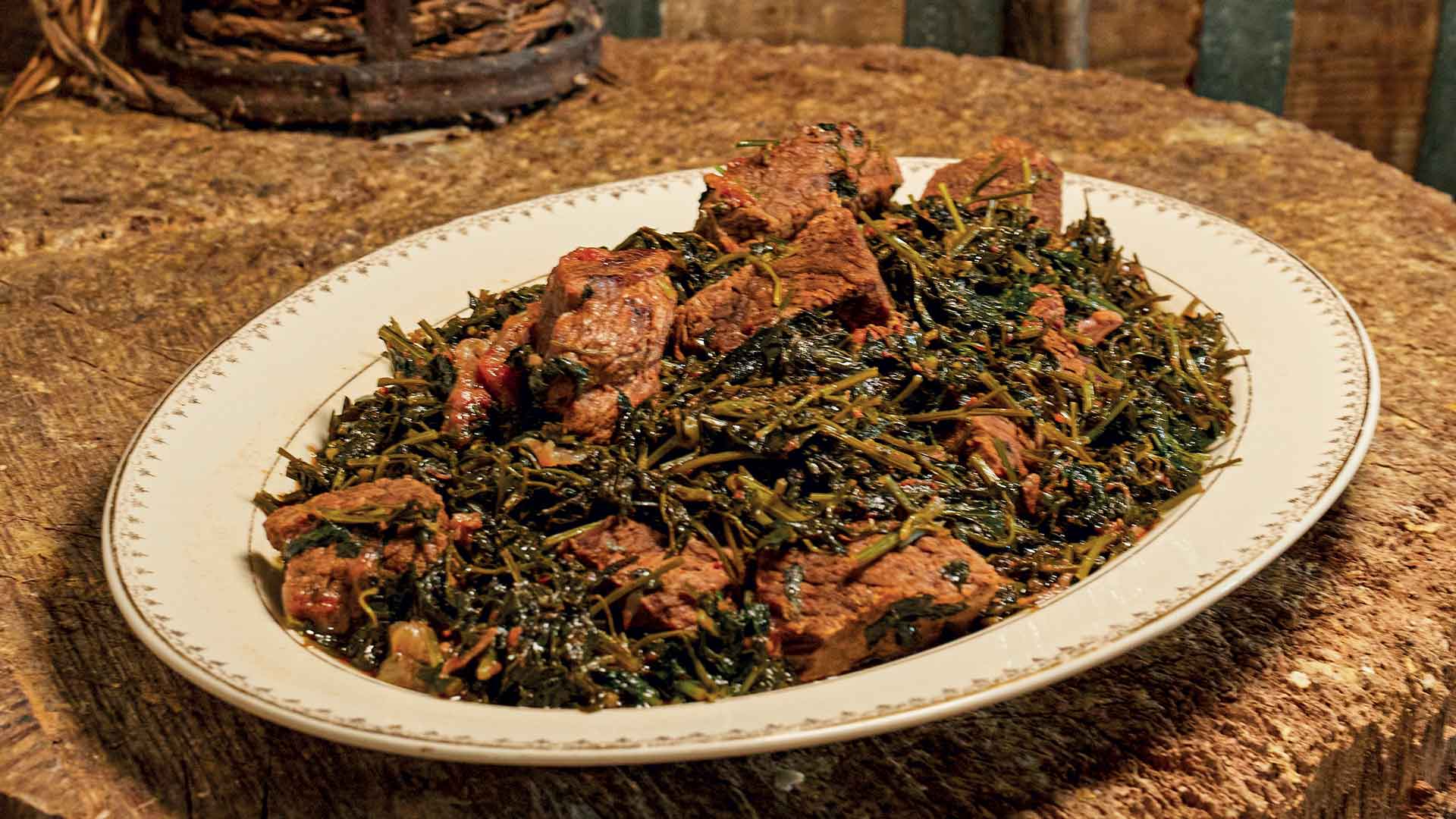 Κάνει σωστό κουμάντο με τα υλικά της, μαγειρεύει με ντόπιες πατάτες και ντόπιο ελαιόλαδο, ξέρει και φτιάχνει καταπληκτικές χυλοπίτες και τραχανάδες. Και από τα υπόλοιπα, μέλι, κρασί, φέτα, μυζήθρα, γιαούρτι, αιγοπρόβατα, κεράσια, βύσσινα, μήλα, καρύδια, κάστανα, κυδώνια, ρόδια, όλα είναι από τον τόπο τους. Τα λαλάγγια της, αυτά τα παραδοσιακά τραγανά, χρυσοτηγανισμένα κριτσίνια, είναι τα ωραιότερα που έχω δοκιμάσει. Το σαγανάκι το κάνει με σφέλα, το ντόπιο τυρί, γνωστό και ως φέτα της φωτιάς. Το βράσιμο των χόρτων είναι ακριβείας, οι τηγανητές πατάτες είναι γλύκα, ροδοκόκκινες και τραγανές, το αγριογούρουνο στιφάδο είναι μύθος, με γλύκα και οξύτητα μαζί, ενώ και το μαϊντανάτο μοσχαράκι είναι παλιό φαγητό σε μια σπάνια αναβίωσή του. Χρήζει δοκιμής η παραδοσιακή χοντρή μακαρονάδα, η τσουχτή, που είναι λουσμένη με καυτό λάδι, τριμμένη μυζήθρα και τηγανητά αυγά μάτια από το κοτέτσι τους. Τα μαγειρέματα εδώ είναι χρωματισμένα με την παράδοση, ταιριασμένα στην εποχή και προσαρμοσμένα στα διαθέσιμα υλικά.