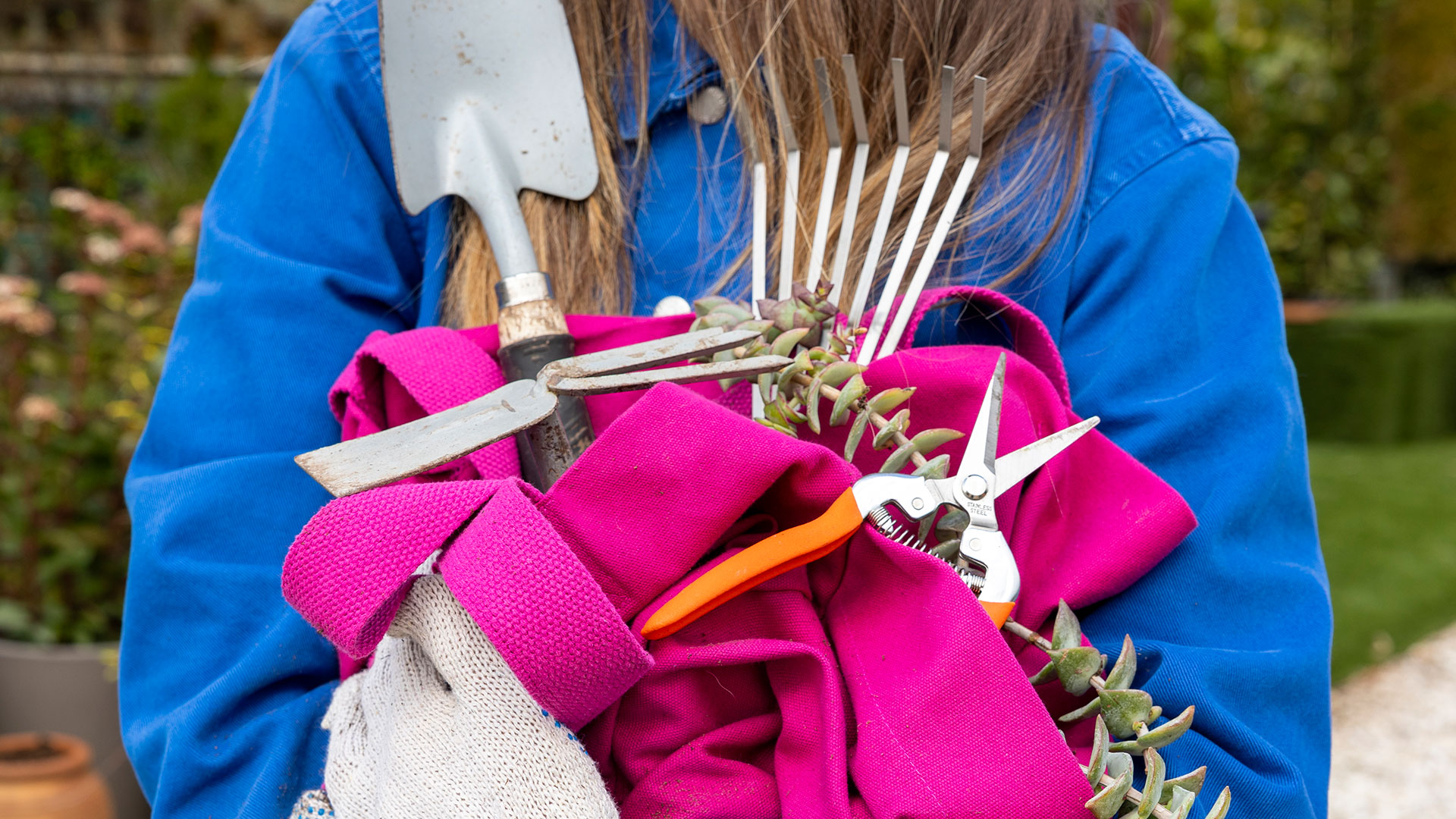 Ξεκινώ με αυτά που κόβουν: έχουμε λοιπόν το σπουδαιότερο όλων, ένα κλαδευτήρι με εργονομική λαβή, με το οποίο κλαδεύουμε ή δίνουμε σχήμα στα φυτά χωρίς να προκαλούμε μεγάλους τραυματισμούς. Με το ψαλίδι, πάλι, κόβουμε λίγο πιο χοντρά κλαδιά, με ένα πριόνι διπλής σειράς δοντιών τα ακόμα μεγαλύτερα. Σειρά έχουν εκείνα που σκάβουν: μια ελαφριά τσάπα δηλαδή και ένα μυτερό φτυάρι, ένα σκαλιστήρι, φτυαράκι (αντί των δύο τελευταίων, χρησιμοποιώ, πολλά χρόνια τώρα, σκεπάρνι) και μια πιρούνα. Για το πότισμα των φυτών χρειάζεστε ποτιστήρι με ρουξούνι (ακροφύσιο-σουρωτήρι) και λάστιχο ποτίσματος με ρυθμιζόμενο εκτοξευτήρα στην άκρη του. Αν έχετε μεγάλο, ωραία διαμορφωμένο κήπο και είστε προχωρημένοι στην κηπουρική, μάλλον είναι απαραίτητος ένας ψεκαστήρας πλάτης για τα ραντίσματα, ένα καρότσι, μια τσουγκράνα, ένα χορτοκοπτικό και ένα μπορντουροψάλιδο. Ακόμα και ελάχιστο χρόνο πάντως αν διαθέτετε στα φυτά σας, μην ξεχνάτε ποτέ ότι πρέπει να προστατεύεστε· προμηθευτείτε λοιπόν ένα αδιαπέραστο από αγκάθια ζευγάρι γαντιών, ένα ανθεκτικό παντελόνι εργασίας, χοντρά παπούτσια κήπου και αδιάβροχες γαλότσες.