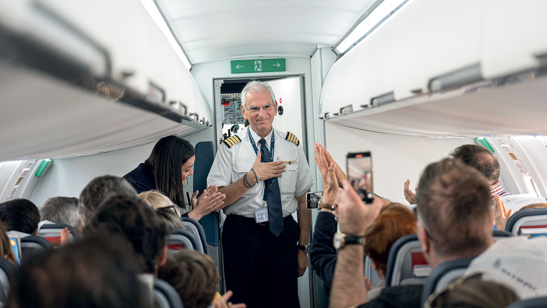 Καθώς πλησιάζουμε στο αεροδρόμιο «Ελευθέριος Βενιζέλος», η αεροσυνοδός Αγγελική Βαφειαδάκη ρωτά τους επιβάτες αν συμφωνούν να γίνουν μέρος στην τελετή αποχώρησης του 65χρονου πιλότου. Είναι όλοι σύμφωνοι – μάλιστα, κάποιοι άνθρωποι μεγαλύτερης ηλικίας δείχνουν συγκινημένοι. Πριν από πολλά χρόνια, 19 επιβάτες δέχτηκαν ένα φορείο με έναν βαριά τραυματία ύστερα από προτροπή του κάπτεν Σινιόρου. Τώρα, κάποιοι άλλοι επιβάτες ετοιμάζονται να τον χειροκροτήσουν και να τον αποχαιρετήσουν σαν να είναι δικός τους άνθρωπος. «Είναι ο καλύτερος», λέει αυθόρμητα η αεροσυνοδός Ελένη Μπούρτζη, πριν ο κυβερνήτης ανοίξει την πόρτα του πιλοτηρίου.