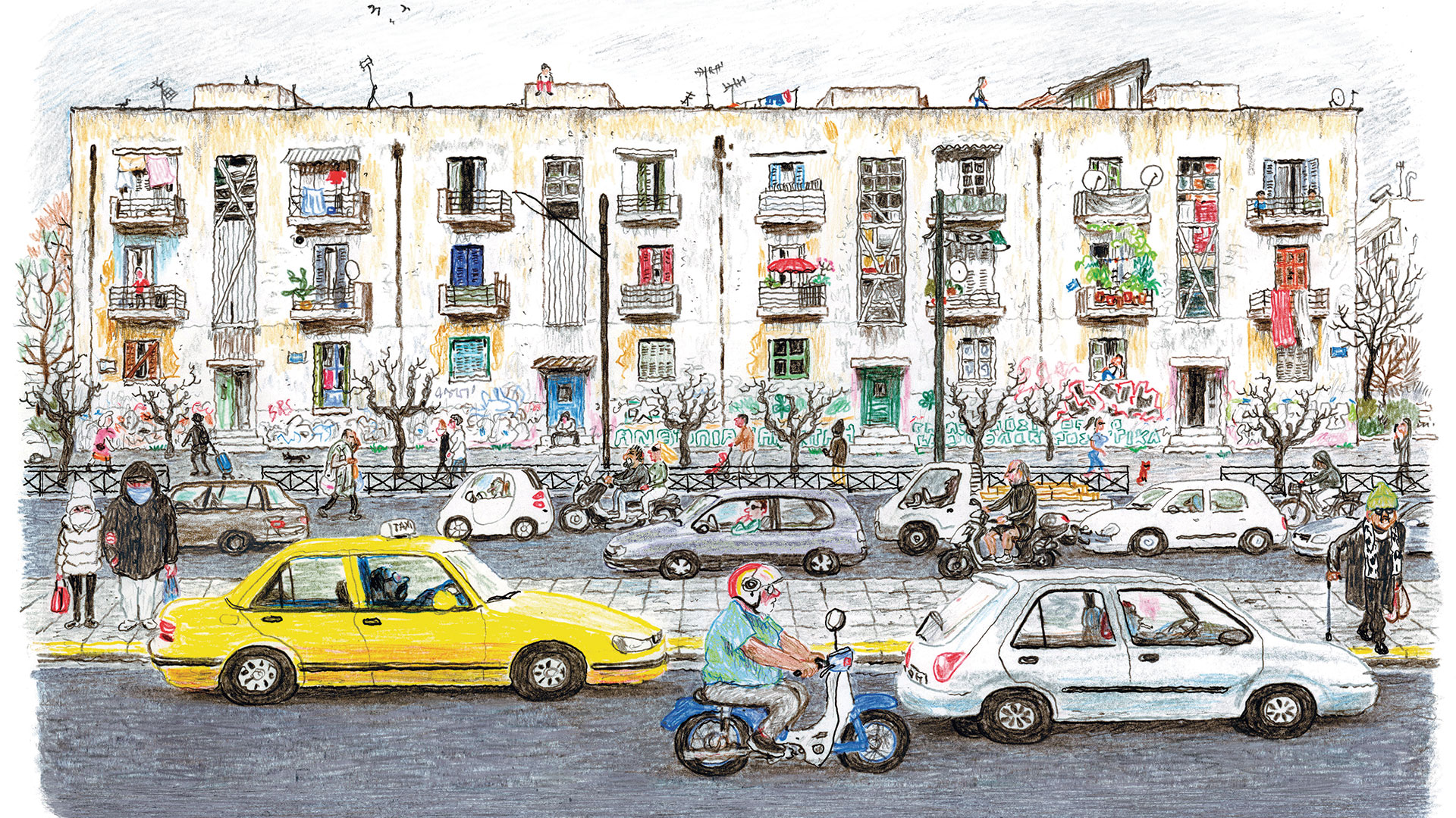 Χαμηλά σπίτια με κεραμίδια και δίπλα τους συγκροτήματα πολυκατοικιών, απλωμένα ρούχα, μισοφέγγαρα, αδέσποτες γάτες, γκράφιτι, ηλεκτρολογεία αυτοκινήτων, μαγειρεία σε ήσυχους δρόμους, ιχθυοπωλεία και μπουλντόζες που σκαλίζουν τα σωθικά της Αθήνας: Όλα τα καταγράφουν οι ξυλομπογιές αλλά και το ipad του Νικολά Ουμπές (Nicolas Hubesch). Ο Γάλλος εικονογράφος βρέθηκε στο Παγκράτι πριν από οκτώ χρόνια λόγω ενός έρωτα. «Ο έρωτας τελείωσε, αλλά εγώ έμεινα», εξηγεί.