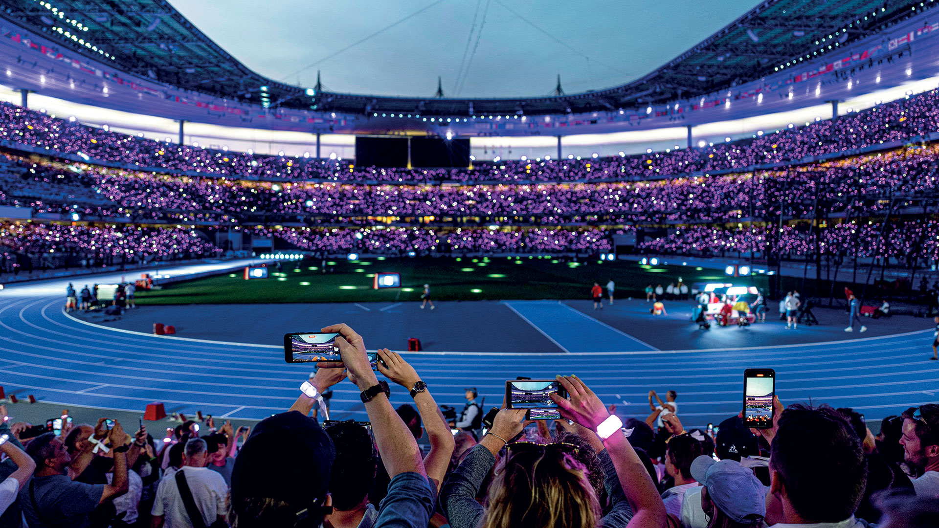 Καθώς τα φώτα χαμηλώνουν στο κατάμεστο Σταντ ντε Φρανς, χιλιάδες θεατές με φωσφοριζέ βραχιολάκια, έχοντας πληρώσει από 90 έως και 1.000 ευρώ για ένα εισιτήριο, ετοιμάζουν τα κινητά τους για τον τελικό των 100 μέτρων ανδρών.