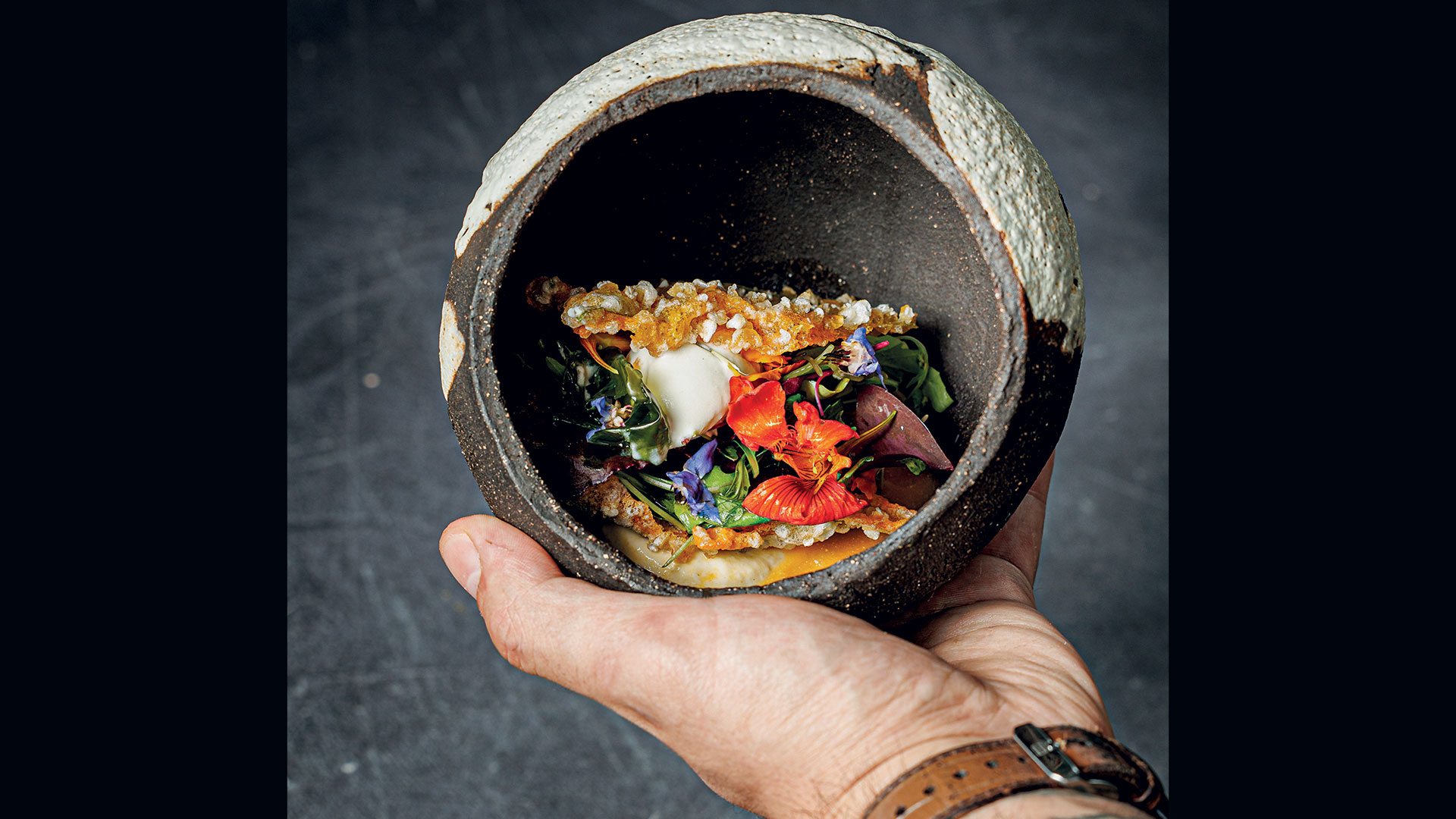 Ήδη από το πρώτο μενού τον χειμώνα, η κουζίνα του μου άρεσε· ο τρόπος που πλέκει μοντέρνες τεχνικές και αναφορές σ’ αυτά με τα οποία μεγάλωσε αλλά κι αυτά που βρήκε στην πορεία, τα εποχικά προϊόντα καλών ντόπιων παραγωγών, τα μοτίβα και τα μικρά visual effects των πιάτων. Τώρα, οι εντάσεις είναι περισσότερες, ενώ συνοδεύονται και από μερικά ωραία παιχνίδια με το καυτερό και το παγωμένο. Κάποια από τα πιο ωραία στοπ καρέ; Ο τραγανός τηγανητός κολοκυθοανθός με αρωματικό αλμυρό παγωτό με χαμομήλι, πάνω σε ένα στρωματάκι από κρατσανιστές πρασινάδες και κρίταμο τουρσί, που εμφανίζεται σε ένα πλάγιο μπολ σαν κρυμμένο σε σπηλιά, το άψογα εκτελεσμένο σουπιόρυζο με καϊμάκι και το αρνί με τη σάλτσα σοκολάτας (ένα πικάντικο μόλε με μπαχαρικά στην ουσία) με φύκια, που του προσθέτει και λίγη θάλασσα, και τα «ανοιξιάτικα λουλούδια», πέταλα και φύλλα σε υγρό άζωτο δηλαδή, σε ένα παγωμένο επιδόρπιο μπουκετάκι με γιαούρτι, πιπέρι καμούτ και άθερμο πετιμέζι.