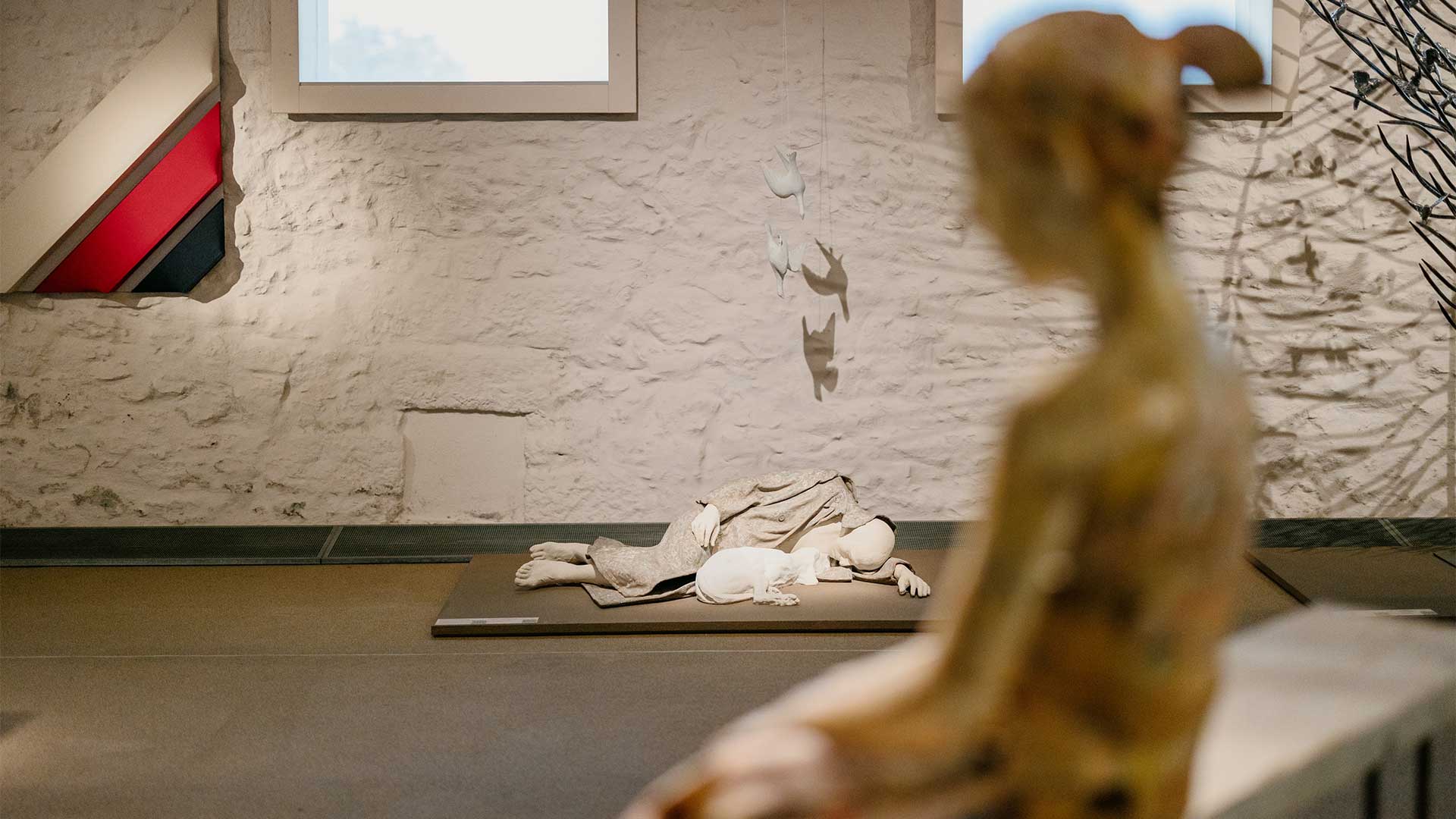 Τον προθάλαμο της Εθνικής Γλυπτοθήκης τον κοσμούν έξι γλυπτά ξένων «μεγάλων δασκάλων» που, πέρα από τη διεθνή τους ακτινοβολία, με τον έναν ή τον άλλο τρόπο, επηρέασαν και την εγχώρια παραγωγή. Στέκομαι για μερικά λεπτά μπροστά στον «Θεραπευτή» του Ρενέ Μαγκρίτ, που πάντα με τρομάζει και συνάμα με μαγνητίζει. Στη συνέχεια, κατευθύνομαι προς το εκδοτήριο-πωλητήριο και ξεκινάω την περιήγησή μου στον χώρο – έχω επιλέξει να έρθω ανεξάρτητα και όχι σε κάποια από τις οργανωμένες ξεναγήσεις που γίνονται κατά καιρούς.