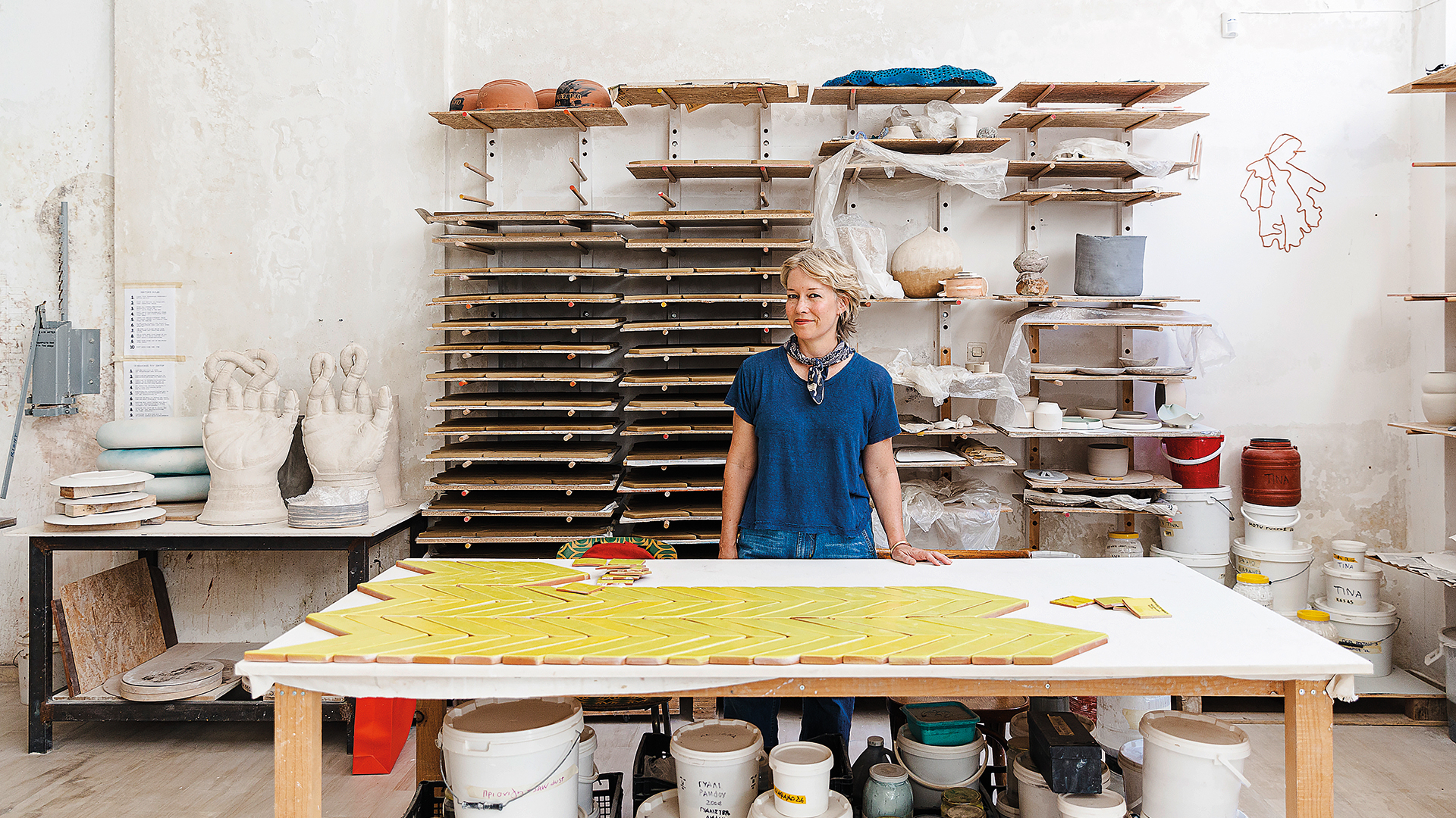 Αναζητώντας στοιχεία για τη σχέση της με την Ελλάδα, έπεσα πάνω σε μια έκθεση που είχε πραγματοποιηθεί στο Βερολίνο το 2009, με τα αφαιρετικά έργα της να βρίσκονται σε διάλογο με εκείνα του Γιάννη Μόραλη. Μου εξηγεί πως δεν είναι η πρώτη φορά που επισκέπτεται την Ελλάδα, το πρώτο της ταξίδι το έκανε ως φοιτήτρια, όπως συνηθίζουν πολλοί Αμερικανοί, και ακολούθησε ένα residency στη Σκόπελο, τον Οκτώβριο του 2008, για να κάνει μια σειρά κεραμικών. Το 2011, το αθηναϊκό κοινό εξοικειώθηκε με τις γεωμετρικές της συνθέσεις στην γκαλερί Helena Papadopoulos, όπου είχε παρουσιάσει την έκθεση Zig Ζags and Curves, με έργα σε λινάτσα και καμβά ζωγραφισμένα με λάδια ή γκουάς, και ακολούθησαν μερικά ακόμα ταξίδια για να δουλέψει πάνω στην κεραμική. Η εμβυθιστική μονοχρωματική εγκατάσταση με κεραμικά πλακίδια που θα δείξει στην Gagosian τον Νοέμβριο, πλαισιωμένη από ζωγραφικά έργα, ήταν και η αφορμή που συναντηθήκαμε στo Sektor30.