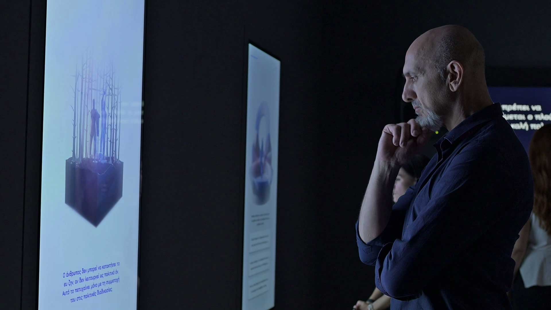 «Οι εκθέσεις που δημιουργήθηκαν είναι αποτέλεσμα ουσιαστικής συνδιαμόρφωσης που προέκυψε από τη συνεργασία μίας ευρείας διεπιστημονικής ομάδας που περιλάμβανε, μεταξύ άλλων, φιλοσόφους, μηχανικούς πληροφορικής, μουσειολόγους και καλλιτέχνες», με ενημερώνει ο Δημήτρης Πετάκος, επιμελητής του AiTHERION. Προσωπικά, βρήκα την έκθεση καλοσχεδιασμένη, γιατί αποτελεί μια phygital εμπειρία που αναδεικνύει κάτι πολύ σημαντικό: το γεγονός ότι το πλαίσιο διεπαφής παίζει ρόλο στη δημιουργία μιας ατμόσφαιρας. Όσο διήρκεσε, δεν σκέφτηκα να δω το κινητό μου. Αντίθετα, έπαιρνα αβίαστα μέρος στις συζητήσεις, μόνο και μόνο για να διαπιστώσω τελικά ότι το δυσκολότερο κομμάτι για μένα ήταν να υποστηρίξω δυνατά τις δικές μου απόψεις, να με ακούσω και να νιώσω σίγουρος ότι υπηρετώ όσα υποστηρίζω. Αυτή η συμμετοχική διαδικασία ήταν για μένα μια υπενθύμιση ότι εκεί που παίρνονται οι αποφάσεις, εκεί έχει νόημα να βρίσκεσαι.