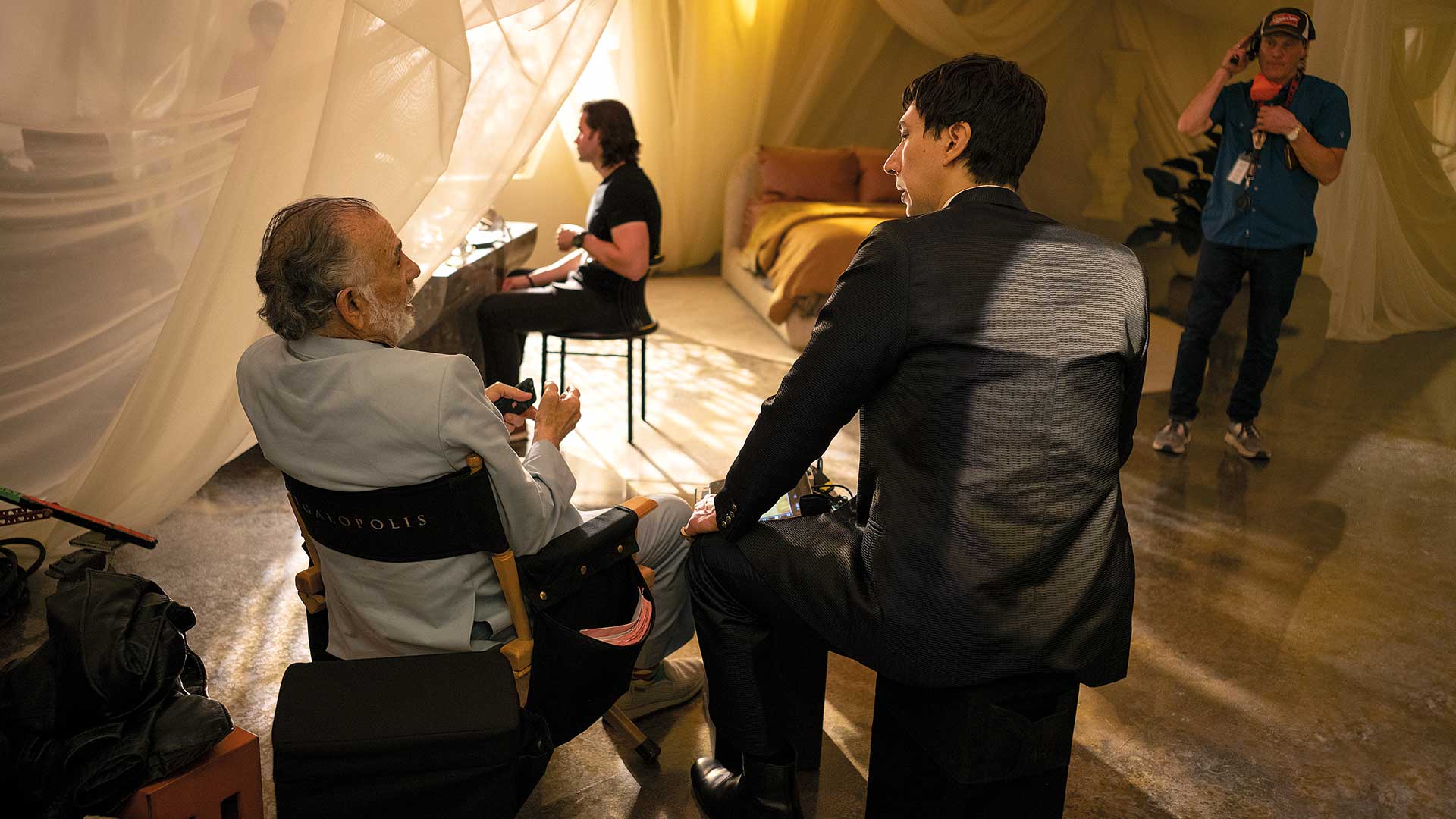 Πίσω του μια μεγάλη μπαλκονόπορτα ανοίγει τη θέα στο ηλιόλουστο τοπίο της Καλιφόρνια. Το δικό του πρόσωπο, παρά τα χρόνια που έχουν εμφανώς περάσει, είναι κι αυτό φωτισμένο από χαρά. Με χαιρετά στα ελληνικά («τι κάνεις;») και αμέσως ξεκινάμε την κουβέντα. Ο λόγος του είναι σχεδόν χειμαρρώδης: είναι ξεκάθαρο ότι ανυπομονεί να μιλήσει, ειδικά γι αυτή την ταινία. Το Megalopolis δεν είναι απλώς η πρώτη ταινία του Φράνσις Φορντ Κόπολα έπειτα από δεκατρία χρόνια, αλλά ένα όνειρο ζωής για τον ίδιο.
