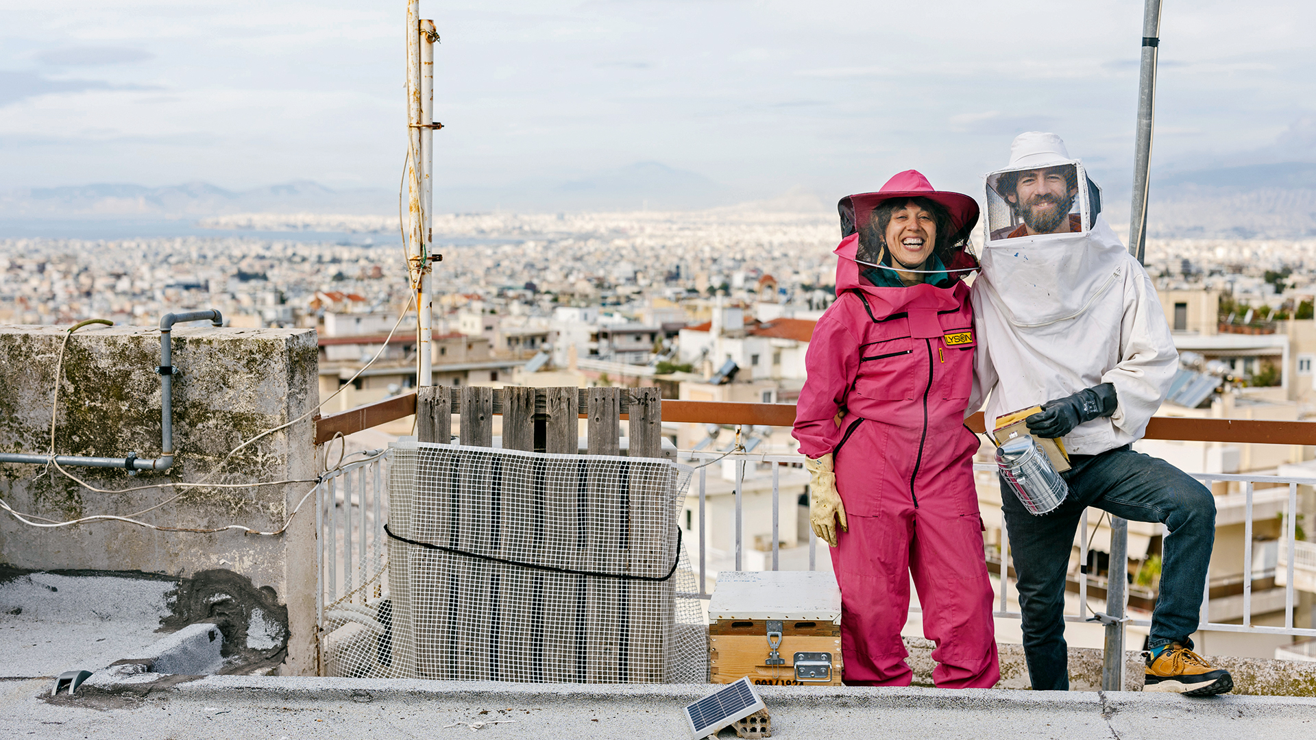Από την ταράτσα μιας πολυκατοικίας στην Ηλιούπολη, στις πλαγιές του Υμηττού, βλέπεις όλη την Αθήνα από τη μία άκρη έως την άλλη. Χτισμένη έως εκεί που φτάνει το μάτι, αυτή η «θάλασσα» από μπετόν είναι για τις μέλισσες ένας τεράστιος κήπος με όλων των λογιών τα λουλούδια. Από αυτή την ταράτσα, ανάμεσα σε σχοινιά για μπουγάδες και ηλιακούς θερμοσίφωνες, πετούν καθημερινά οι μέλισσες από τις δύο κυψέλες που έχει τοποθετήσει ο μελισσοκόμος Νίκος Χατζηλίας.
