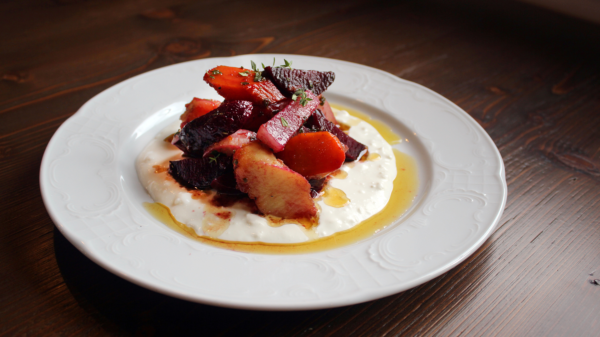 Ξεκινήσαμε με τη νεραντζοσαλάτα (παρότι δεν περιέχει νεράντζια, έτσι τη λένε στα Επτάνησα), μια σαλάτα με γλυκολέμονα –μια ιδιαίτερη ποικιλία μικρών, γλυκών λεμονιών–, γκρέιπφρουτ και πορτοκάλια. Στα Επτάνησα τη σερβίρουν απλή, εδώ όμως ήρθε με μπουράτα. Μια έκρηξη φρεσκάδας, με το ξινό, το γλυκό και το αλμυρό στοιχείο σε ισορροπία. Θα ήθελα όμως να τη δοκιμάσω χωρίς το τυρί, όπως συνηθίζεται παραδοσιακά. Τα γαρδουμπάκια, μια συνταγή με βαθιές ρίζες στην Κορινθία, είναι καλοψημένα, τραγανά εξωτερικά και τρυφερά μέσα. Ο σεφ τα έκανε φρικασέ με μαρούλια, αντίδια και λάπαθα από τον κήπο τους. Δεν ήθελα να τελειώσουν. Το ψητό κουνουπίδι στα κάρβουνα, με αμύγδαλο και μια λεπτή καπνάδα, είναι λίγο πιο μαλακό από το επιθυμητό, αλλά έχει ωραία γεύση. Σειρά είχαν τα bucatini με κεφτεδάκια αγριογούρουνου και σάλτσα παστιτσάδο. Μικρούλικα κεφτεδάκια, όπως συνηθίζονται στην Ιταλία και στα ιταλοεπηρεασμένα Επτάνησα. «Μικρός, θυμάμαι, έφτιαχνα τα κεφτεδάκια για να βοηθήσω στις προετοιμασίες του τραπεζιού», λέει ο σεφ. Το αγριογούρουνο είναι από την περιοχή, η σάλτσα είναι νόστιμη, αλλά θα ήθελα λίγο περισσότερη ένταση. Τα σιγομαγειρεμένα μάγουλα με κόκκινο κρασί και τραχανά είναι από τα πιο προσεγμένα πιάτα. Με δύο είδη τραχανά, γλυκό και ξινό – ωραία ιδέα, γιατί ο ένας συμπληρώνει τον άλλον. Το σοφρίτο ήρθε σωστά μαγειρεμένο, με τη σάλτσα του δεμένη και λιγότερο όξινη από το παραδοσιακό κερκυραϊκό, για να μην καπελώνει το κρασί.