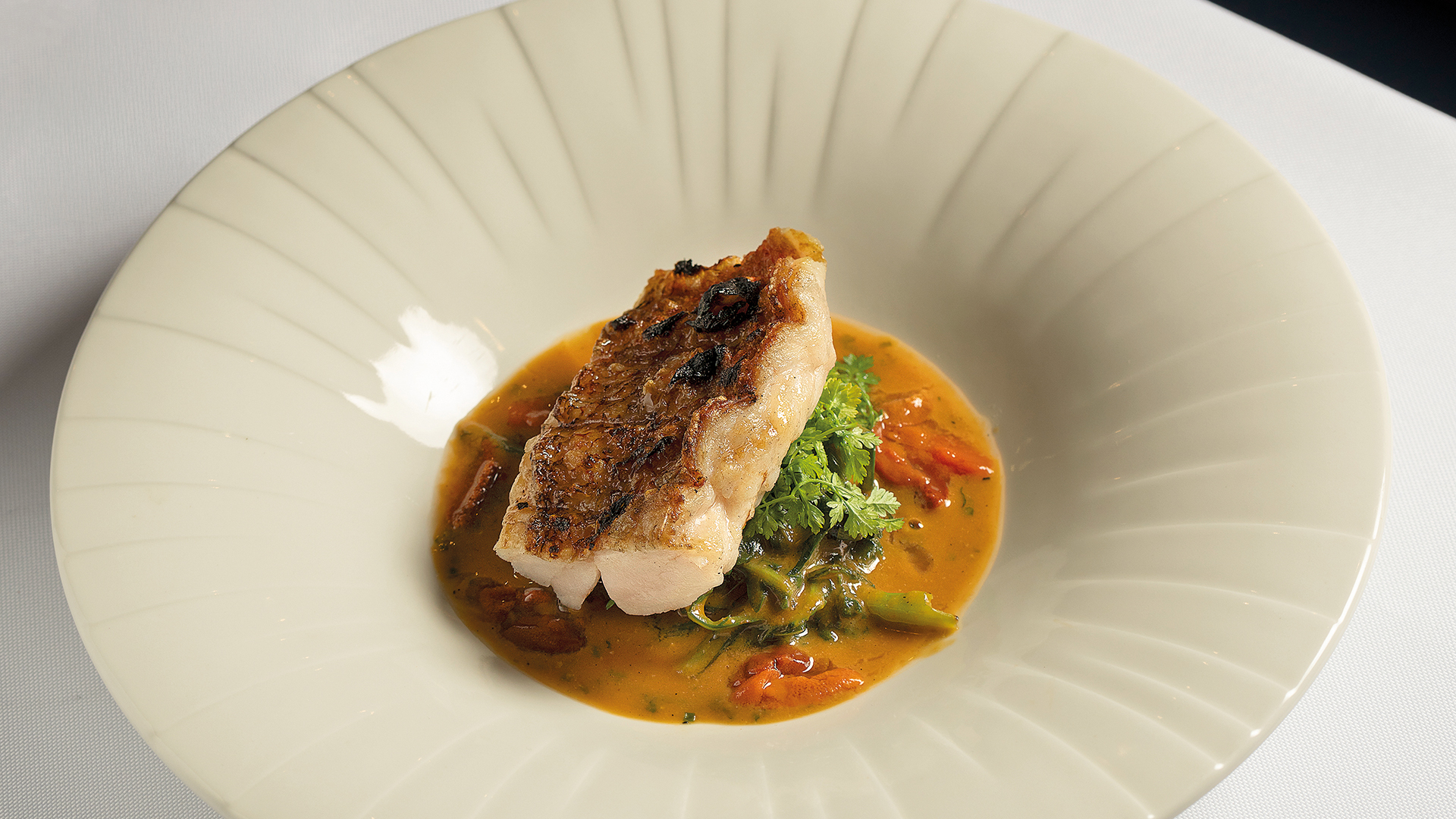 Στο μενού βρίσκεις ταραμοσαλάτα με ψαρένια ένταση και άψογα ψημένες καραβίδες, βρίσκεις και σφυρίδα ταρτάρ, σερβιρισμένη με δροσερές φετούλες φινόκιο, πάνω σε κρέμα πρασοσέλινου, στεφανωμένη με «σταφύλι της θάλασσας», ένα φύκι που μοιάζει όντως με άγουρο τσαμπί σταφύλι και αφήνει στο στόμα θαλασσινή δροσιά. Τα συμπαθητικά κεμπάπ τόνου, τυλιγμένα με «λωρίδες» από κέτσαπ πιπεριάς Φλωρίνης που έρχονται παρέα με καπνιστή μελιτζανοσαλάτα, είναι καλή ιδέα για τη μέση, αλλά αξίζει να δοκιμάσεις και τα σύγχρονης λογικής μαγειρευτά, σαν τη ζουμερή σκορπίνα με τα τσιγαριαστά χόρτα που μοσχοβολάει μάραθο, λεμόνι και ιώδιο, ή την τραγανή ρεβιθάδα με μπακαλιάρο και όλο ζωντάνια σέσκουλα, που τα περνάνε πρώτα από τα κάρβουνα. Το ταρτάρ τόνου με τηγανητό κρεμμύδι, τρούφα και αφρό από τα κόκαλα του ψαριού για μένα παραείναι φορτωμένο, αλλά το λιχούδικο «οσομπούκο» πεσκανδρίτσας με το αρσενικό Νάξου και η σιτεμένη «μπριζόλα τόνου» (φιλέτο και πιο λιπαρή κοιλιά) με ντεμιγκλάς με το μεδούλι του, που έχει σχεδόν κρεατένια νοστιμιά και συνοδεύεται από παραπούλια και τριπλοτηγανισμένες πατάτες, αντικατοπτρίζουν ωραία την πιο κοσμοπολίτικη πλευρά του καταλόγου. Με τη μαγειρική πυξίδα να δείχνει προς διάφορες κατευθύνσεις, στο εστιατόριο, στα τραπέζια του οποίου βλέπεις επιχειρηματίες, οικογένειες, ζευγάρια και θεατρόφιλους που εμφανίζονται με το που τελειώσει η παράσταση, έχεις πολλές επιλογές. Το εξυπηρετικό και ενημερωμένο σέρβις, η πλούσια λίστα κρασιών και αποσταγμάτων και ένας σομελιέ έτοιμος να βοηθήσει στα ταιριάσματα κάνουν καλό σεγόντο. Μόνο ο αχνιστός ροφός θα προτιμούσα να λείπει· παρότι δεν απαγορεύεται σε αυτά τα μεγέθη, πλέον κινδυνεύει σοβαρά με αφανισμό, οπότε θα ’θελα να δω εστιατόρια που πρεσβεύουν την ποιοτική ψαροφαγία να τον αφήνουν στην άκρη. Άντε και οι ψεύτικες μπουκαμβίλιες στο ντεκ.