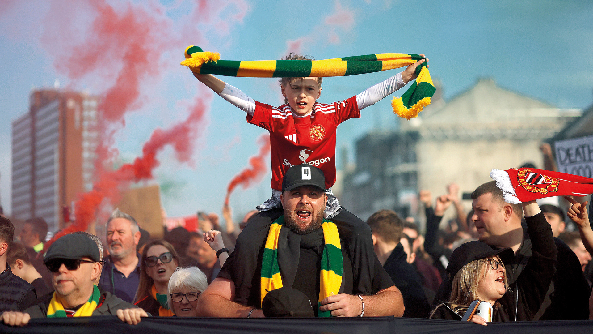 Οι περισσότεροι από τους διαδηλωτές ήταν μαυροντυμένοι. Κάποιοι φορούσαν διακριτικά της ομάδας, κόκκινα ή λευκά. Και κάποιοι άλλοι φορούσαν αυτά τα κασκόλ με το κίτρινο και το πράσινο· τα χρώματα της Νιούτον Χιθ, της ομάδας που ιδρύθηκε το 1878 και αργότερα μετονομάστηκε σε Μάντσεστερ Γιουνάιτεντ. Τα κιτρινοπράσινα κασκόλ εμφανίστηκαν ως ένδειξη αντίδρασης για την αμερικανική εισβολή των Γκλέιζερ πριν από είκοσι χρόνια και έκτοτε αποτελούν τα χρώματα της αντίστασης· απέναντι στους Γκλέιζερ, απέναντι στο σαρωτικό «μοντέρνο ποδόσφαιρο». Είναι τα χρώματα της αθωότητας· τα χρώματα της αγνότητας και της υγείας του οπαδικού κινήματος. Γι’ αυτό βγήκαν στους δρόμους οι οπαδοί της Γιουνάιτεντ.